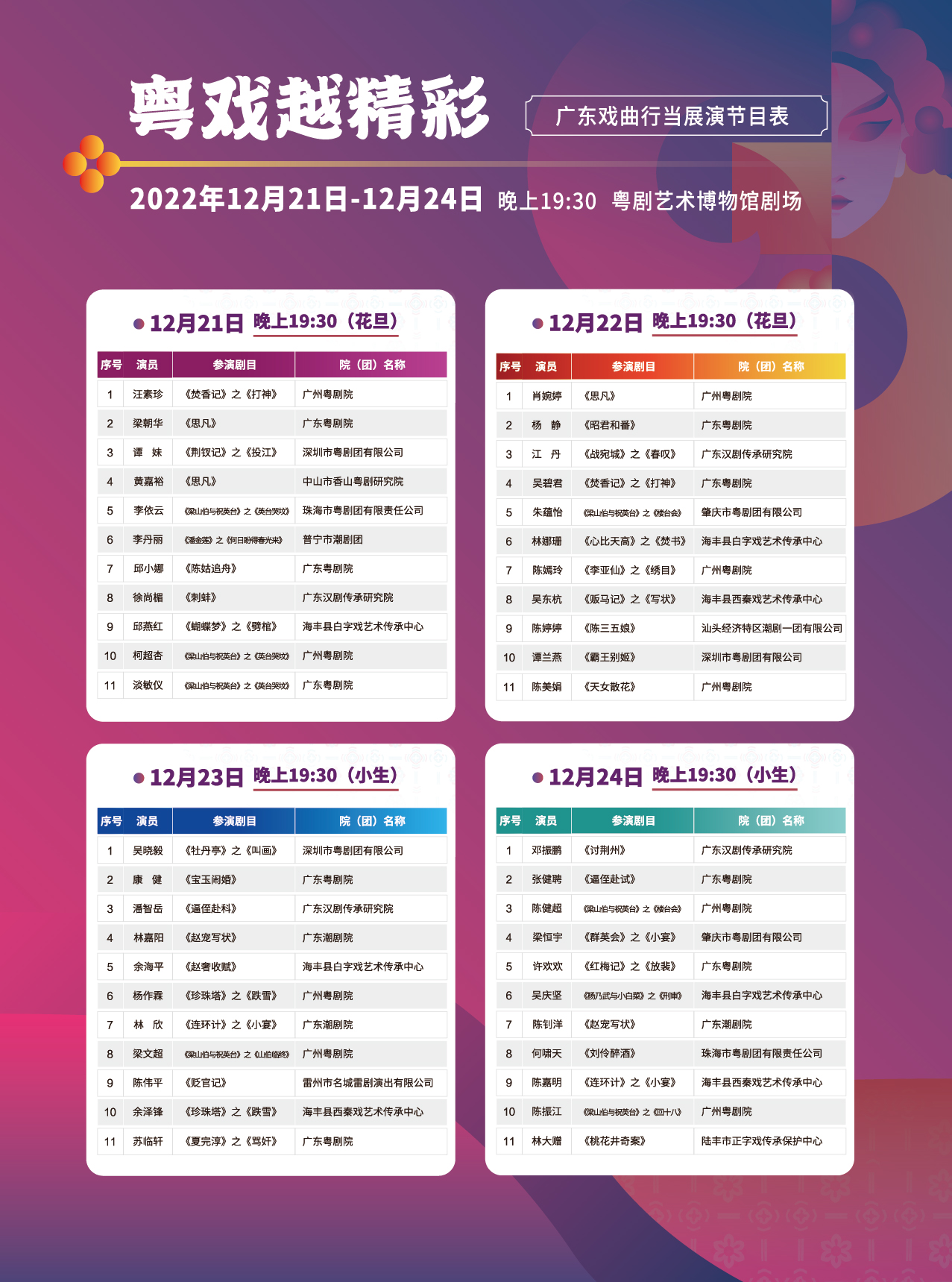本次花旦、小生行当展演云集了一众优秀青年演员,包括广东粤剧院的梁朝华、邱小娜、康健、苏临轩,广州粤剧院的汪素珍、肖婉婷、梁文超、陈振江,广东汉剧传承研究院的徐尚楣,海丰县西秦戏艺术传承中心的吴东杭、普宁市潮剧团的李丹丽、海丰县白字戏艺术传承中心的邱燕红等。这些演员将现场演绎各大剧种的经典剧目,包括《思凡》、《陈三五娘》、《讨荆州》、《贬官记》、《杨乃武与小白菜》之《刑审》、《贩马记》之《写状》、《桃花井奇案》等,令观众过足戏瘾。