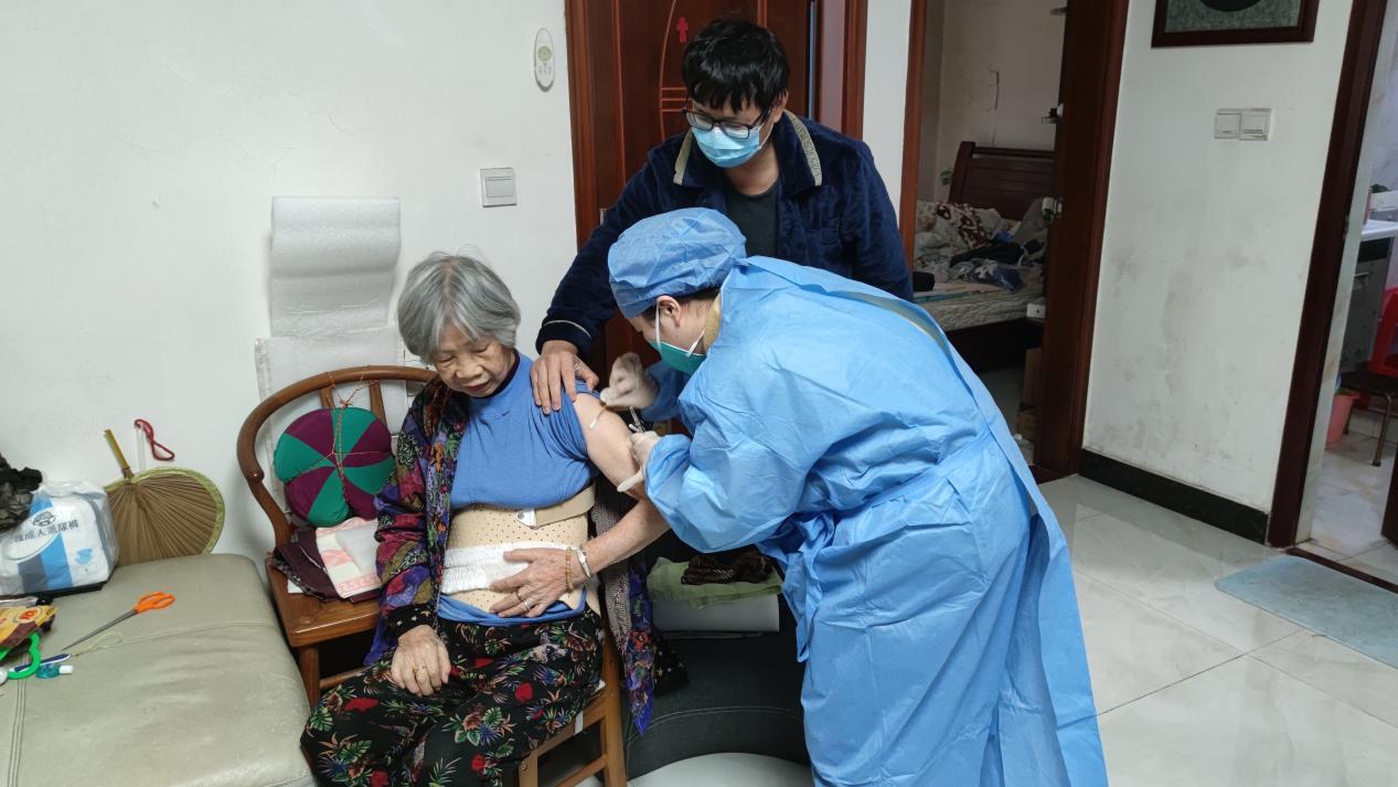 本月月初,73岁的杨佩兰老人向居委会提出申请,并详细阐述了患有脑出血和摔伤过腰椎的病史,担心年纪大体质弱,易出现不良反应等。第二天,街道立即安排广医五院医护上门为老人评估健康状况,为老人测量血压、心率,通过查看老人病历并反复询问老人的其他基础疾病及日常用药的方式,消除了老人的顾虑,并在家里成功接种第一针。“接种了之后放心多了,谢谢工作人员的耐心,” 杨佩兰说。