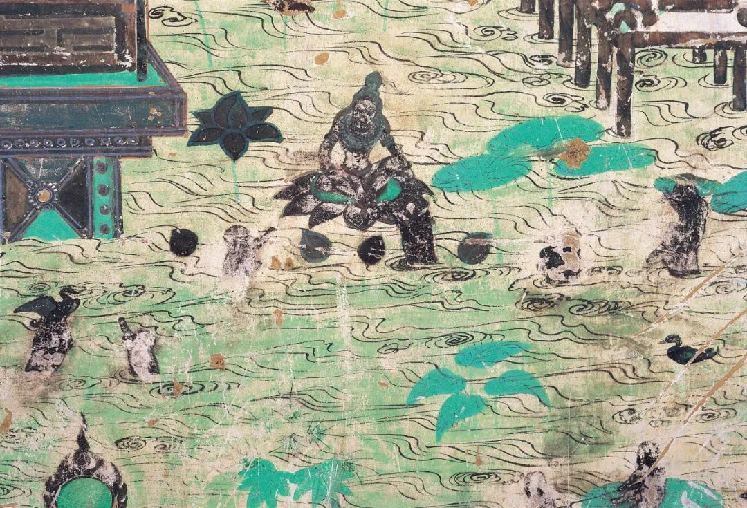 在莫高窟第172窟山水画中,河流由远及近产生的纵深感,以及近景水面形成的波光粼粼的效果,这种对光影效果的追求让人赞叹古人的绘画技艺。敦煌壁画中隋唐或者五代的青绿山水,除了山峦以青绿色为主,可以看出明暗和远近关系,而且往往画出完整的天空、彩云、夕阳等。但这些都是唐以后山水画中渐渐失传的画法,宋代画家们已经树立起了水墨画的笔墨体系,并使水墨山水的审美体系逐步完善了。