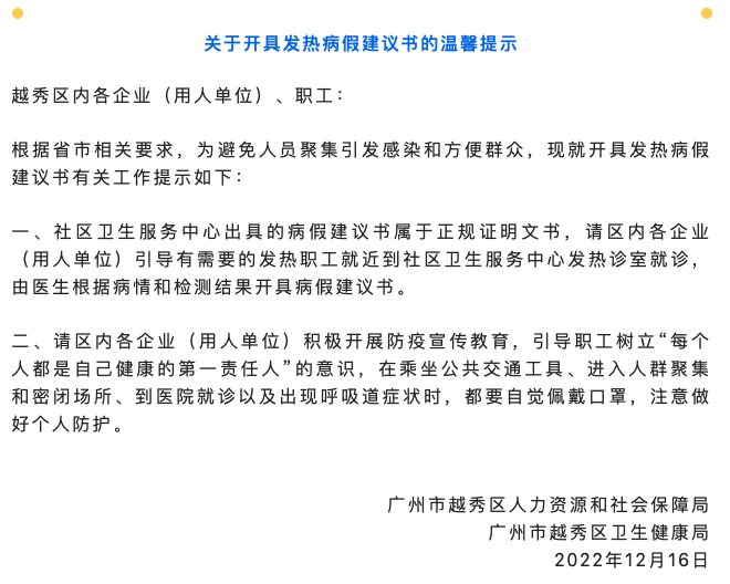 12月16日,广州市越秀区人力资源和社会保障局、广州市越秀区卫生健康局联合发布关于开具发热病假建议书的温馨提示。提示称,社区卫生服务中心出具的病假建议书属于正规证明文书,请区内各企业(用人单位)引导有需要的发热职工就近到社区卫生服务中心发热诊室就诊,由医生根据病情和检测结果开具病假建议书;请区内各企业(用人单位)积极开展防疫宣传教育,引导职工树立“每个人都是自己健康的第一责任人”的意识,在乘坐公共交通工具、进入人群聚集和密闭场所、到医院就诊以及出现呼吸道症状时,都要自觉佩戴口罩,注意做好个人防护。