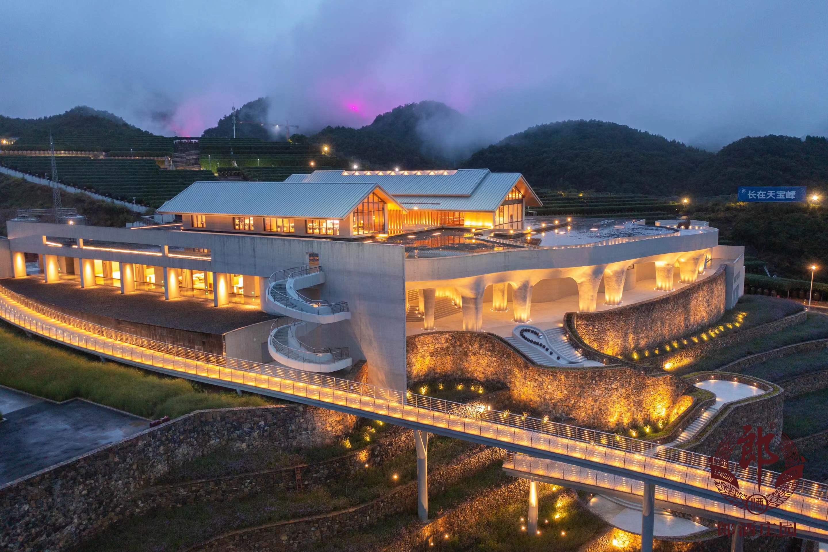 郎酒庄园“地之阁”位于天宝峰之巅,顺应山势,向东而立,有着紫气东来的美好寓意,整体建筑设计形似一柄玉如意,由如意桥作为玉柄连接起两端,匠心独具。