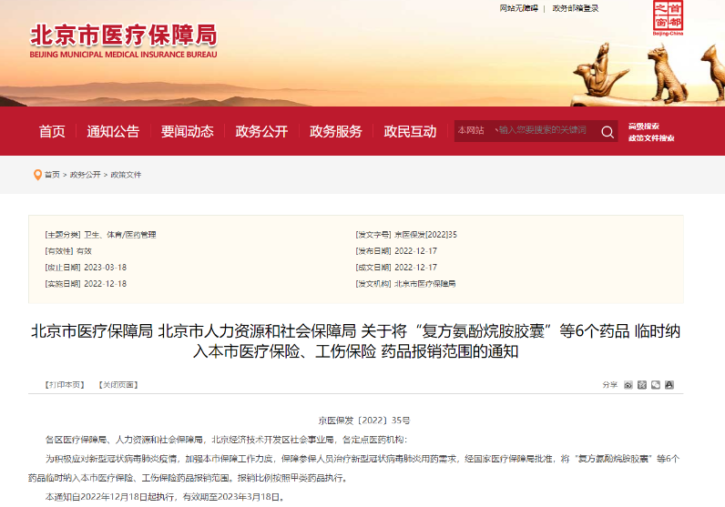 北京市医疗保障局12月17日发通知称,为积极应对新型冠状病毒肺炎疫情,加强北京市保障工作力度,保障参保人员治疗新型冠状病毒肺炎用药需求,经国家医疗保障局批准,将“复方氨酚烷胺胶囊”等6个药品临时纳入北京市医疗保险、工伤保险药品报销范围。报销比例按照甲类药品执行。本通知自2022年12月18日起执行,有效期至2023年3月18日。