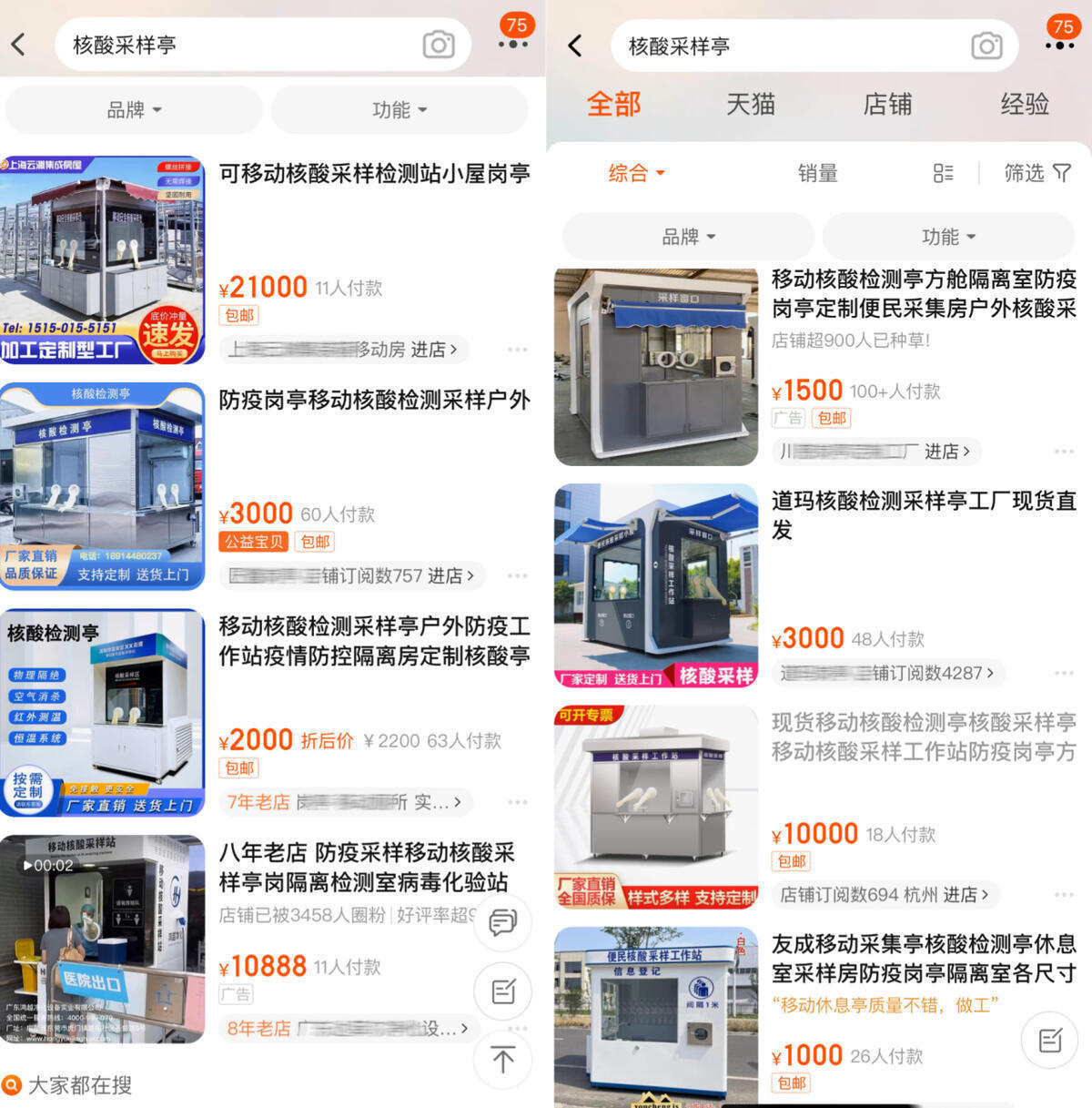 浙江在线记者查询浙江多地官方公开信息发现,一个移动核酸采样小屋往往需要花费数万元。例如,舟山群岛新区新城管理委员会今年5月份曾进行移动式核酸采样小屋采购项目招标,计划采购26套,预算金额104万,平均4万/套;宁波余姚市卫生健康局核酸采样小屋项目中标结果显示,采购的100间核酸采样小屋总价275万,平均2.75万/间。此外,浙江在线记者在部分电商平台上查询到,采样小屋的价格在几千到上万元不等。