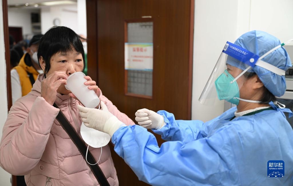 12月13日,在广州市荔湾区人民医院,老年居民在接种吸入式新冠疫苗。
