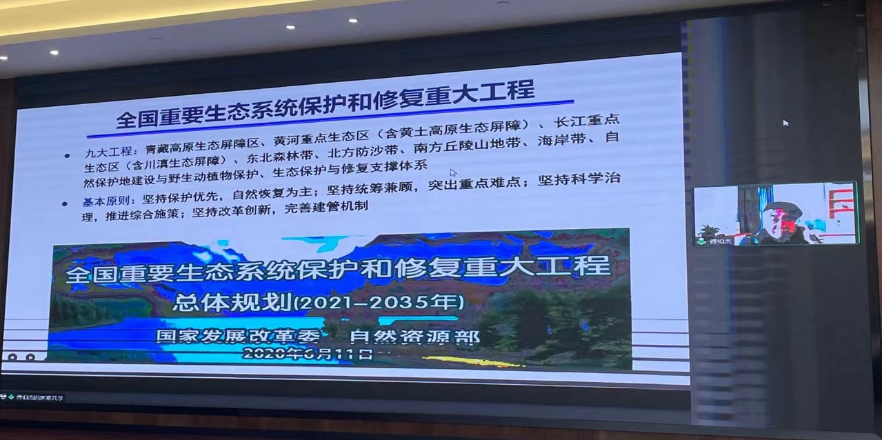 在主题演讲环节。中国科学院院士傅伯杰首先做了题为《山水林田湖草沙一体化保护修复》的报告。傅伯杰表示,山水林田湖草沙一体化保护修复是指基于自然地理格局,遵循生态系统演替规律和内在机理,适应气候变化趋势,依托国土空间规划,对生态功能退化,生态系统受损、空间格局失衡,自然资源开发利用不合理的生态、农业、城镇国土空间,统筹和科学开展的山水林田湖草沙一体化保护修复。国土空间生态修复是维护国家与区域生态安全,提升生态系统质量和稳定性、强化农田生态功能,提升城市生态品质,增强生态系统服务能力的重要举措,是助力国土空间格局优化,提供优良生态产品的重要途径,是加快建设人与自然和谐共生的现代化的重要支撑。傅伯杰说:“山水林田湖草是生命共同体,要统筹兼顾,整体施策,多措并举,全方位、全地域、全过程开展生态文明建设。”