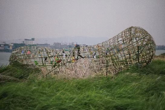 第一件作品名叫孕育,作品放置于平沙岛东岸,形态像一个镂空的蚕茧,丝织业曾是平沙岛的传统产业,而这件作品的组成材料有鱼篓、工业垃圾、渔网、流木等。第二件作品名叫轮回,位于平沙岛西岸,形态是三个递进的圆环。第一个圆环由代表植物的枯木组合,第二个圆环是小一点的由人类文明产物(塑料制品)组成,第三个更小的圆环由代表自然的泥土组成,其组成材料为竹、泥土、工业垃圾。第三件艺术作品叫渔夫。渔民曾是平沙岛上的代表性职业,作品通过河滩上的流木组合成一个抽象的渔夫拉网形象,网袋内装着的是河边拉上来的沉重垃圾,昭示大家破坏生态环境最终破坏的也是人类自身的生存空间,该作品的组成材料为流木、工业垃圾、渔网。最后一件作品为自然的容器。作品主要以钢筋、流木、工业废料组成,形象参考了当地的农作物竹笋,作品如同竹笋一般在大地中发芽生长,组成材料为钢筋、工业垃圾、渔网、流木。