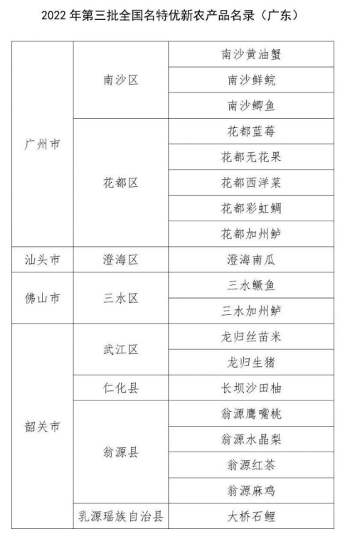 近日,农业农村部农产品质量安全中心公布2022年第三批全国名特优新农产品名录,其中,广州市花都区的5个农产品赫然在目,它们分别是“花都蓝莓”“花都无花果”“花都西洋菜”“花都彩虹鲷”和“花都加州鲈”,入选数量在全省各区县中位列第一。