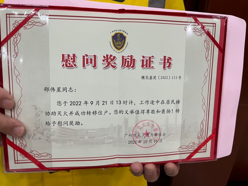邵伟星向记者回忆道,今年9月21日中午12点50分左右,他骑着电动自行车来到越秀区大南路附近送外卖,忽然闻到一股很浓的烟味,抬头一看,只见一栋老式居民楼的五楼窗口处冒出大量浓烟。“不好!着火了!得赶紧救人救火!”当时情况紧急,邵伟星脑海里只有一个念头,就是赶紧把火给扑灭,千万不能造成人员伤亡,他来不及多想,赶紧将车丢在一旁,立即跑到附近商铺借到了两个灭火器,紧接着拔腿冲上起火楼层救火。