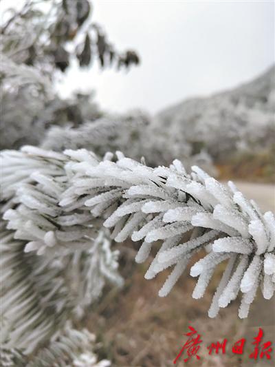 受冷空气影响,梅州市丰顺县各地气温急剧下降。昨日记者从丰顺县获悉,在海拔1500多米的粤东第一峰铜鼓峰近日出现罕见的雾凇景观,漫山遍野银装素裹,分外迷人。