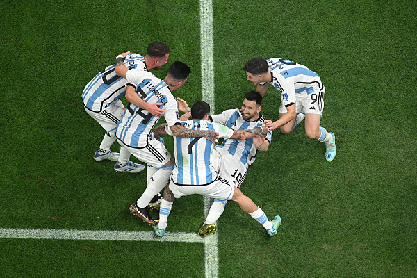 阿根廷队和法国队此前都曾经两夺世界杯冠军。在这场决赛之前,两队一共交手12次,阿根廷队以6胜3负3平占优。在世界杯赛场上,双方交手3次,阿根廷队累积2胜1负。在1930年和1978年的两次相遇,阿根廷人都赢了。4年前,在俄罗斯世界杯1/8决赛上,法国人以4比3获胜,梅西与阿根廷队遗憾出局。来到今天凌晨,到底哪一队的球衣上再添一颗星,是梅西实至名归“球王加冕”还是姆巴佩改朝换代“新王登基”?终于有了答案。开场23分钟,梅西以一记点球先声夺人;第36分钟,34岁的迪马利亚破门,阿根廷队以2比0领先结束上半场。进入下半场,场上风云突变,姆巴佩梅开二度,两个进球仅间隔97秒,创下一项世界杯决赛新纪录,同时也协助法国队把比分扳至2比2。