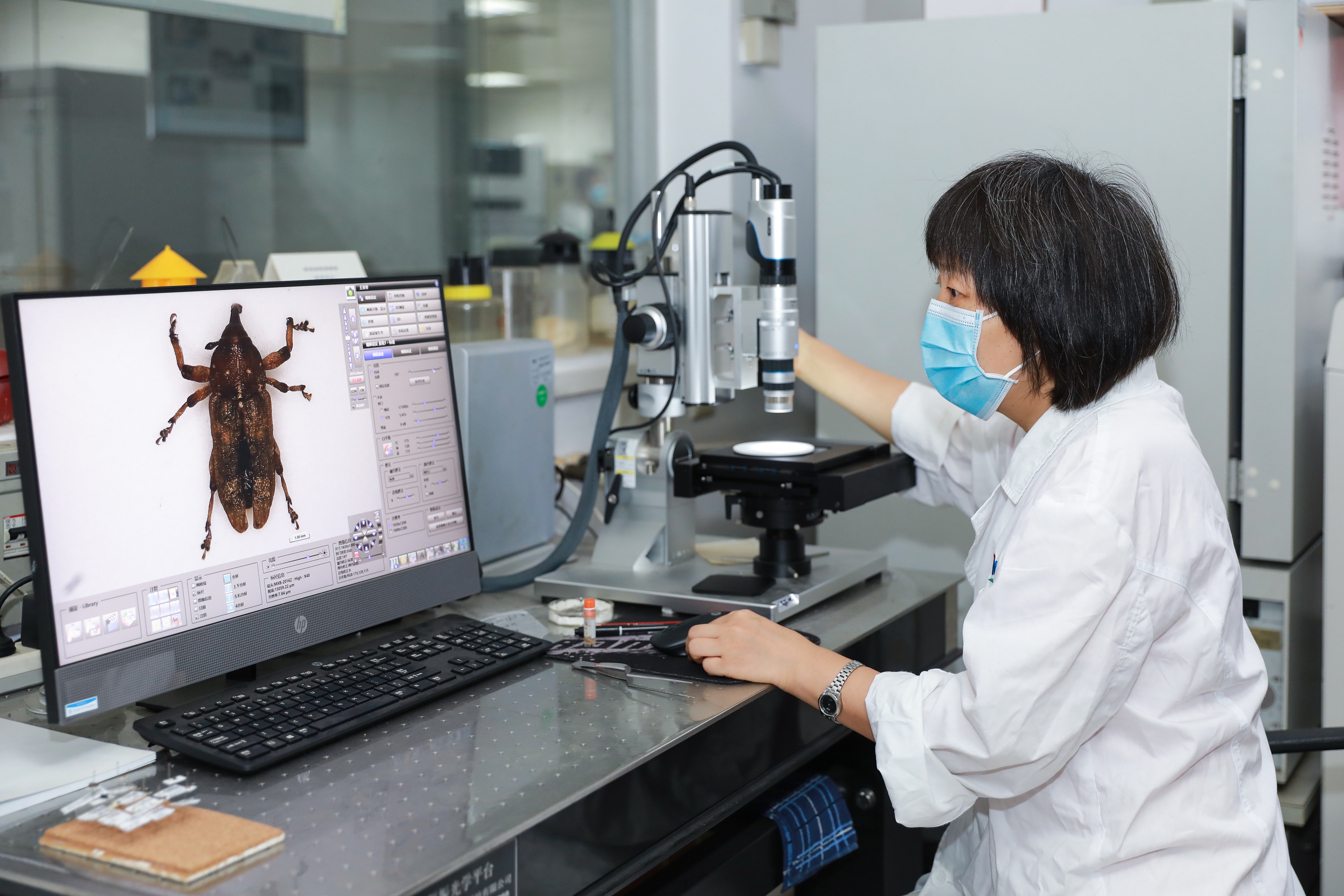 广州海关技术中心研究人员正在鉴定从进境植物产品中截获的外来生物。