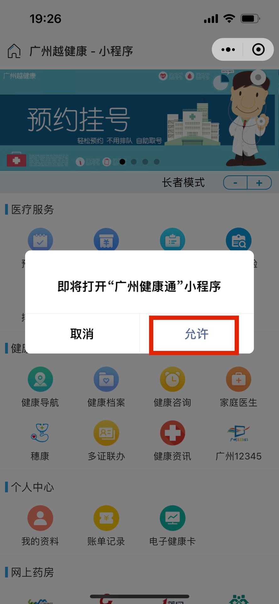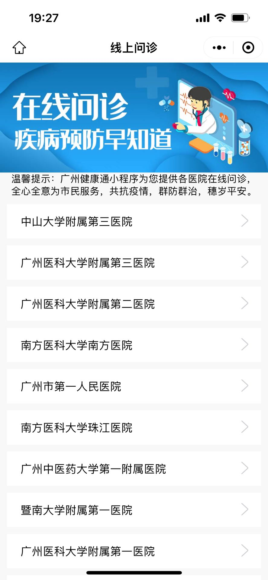 集成“广州健康通”微信小程序,为居民提供广州市内17家医院、5家第三方问诊平台的在线问诊入口。