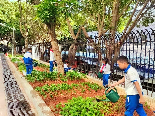 华峰学校毗邻革命圣地华峰山,充分利用得天独厚的环境开展自然教育,让优美的校园环境滋养着莘莘学子的心灵。2021年秋季开学以来,学校的同学们拥有了一片小菜园,在这里,他们亲历翻地、播种、浇水、施肥、捉虫、收获,见证了一粒种子的一生成长,体验从种子到餐桌的全过程,菜园成了同学们劳动教育户外的天然课室。