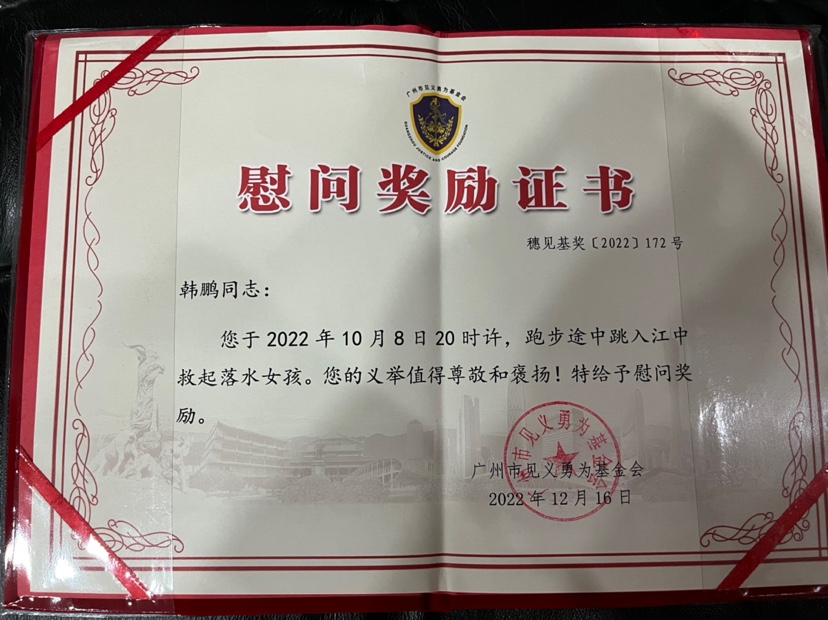 当别人身处危难当中,你会怎么做?眼看珠江水就要没过失足落水者头部,危机之际,在珠江边夜跑的广州市民韩鹏没有丝毫犹豫,纵深一跃奋勇跳进了珠江救人。因为见义勇为之举,韩鹏近日获得广州市见义勇为基金会慰问奖励。
