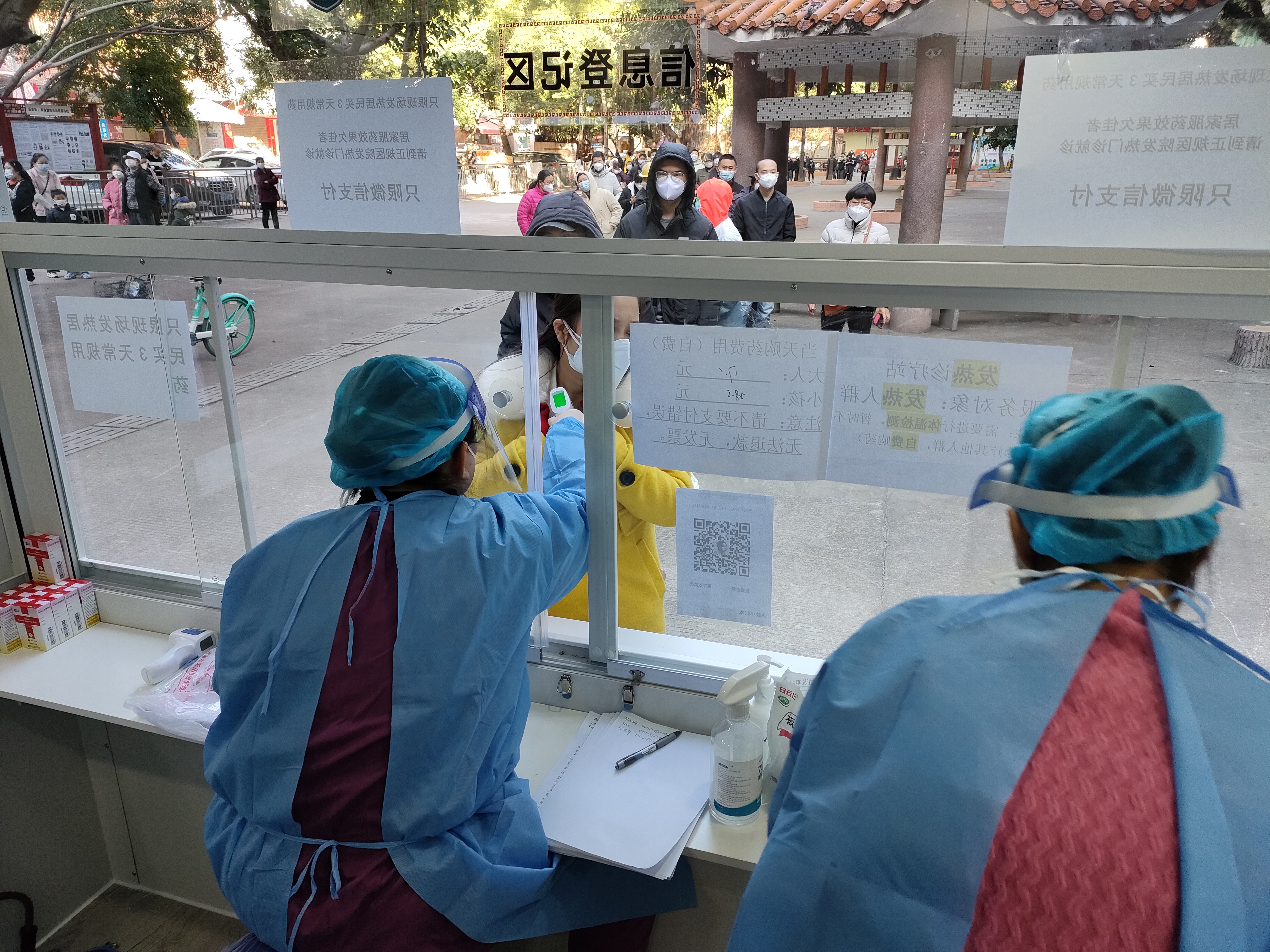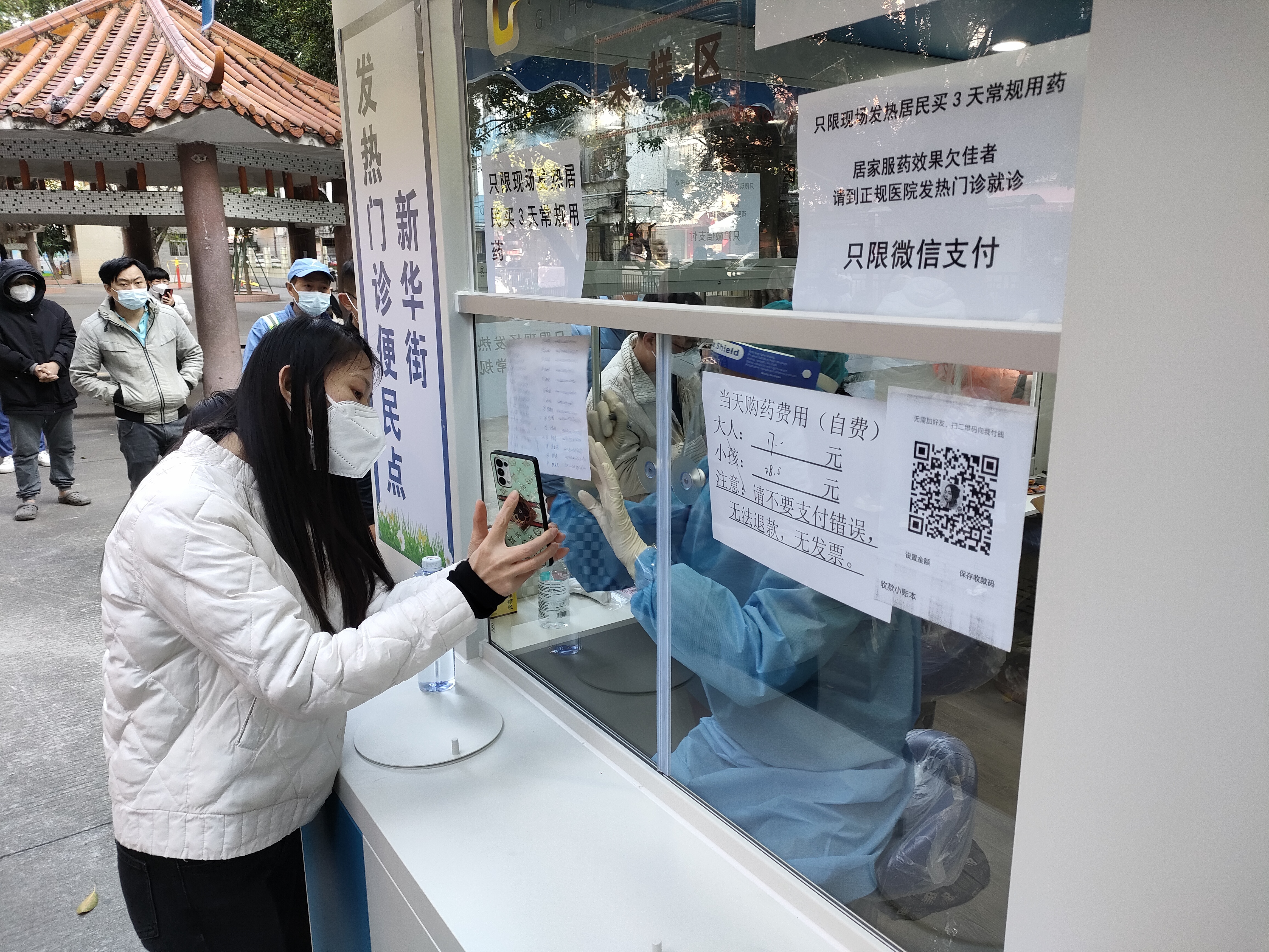12月21日,记者在现场看到,有需要的市民都在便民点外有序排队扫码购药,两名医护人员全副武装,在为患者问诊配药。记者算了下时间,从就诊到拿药全程都非常便捷,最快只需五分钟就可以完成付款拿药走人,且省去了中间挂号等不少环节。