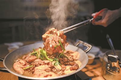 近年来,发达的外卖推动冬至餐厅菜肴走入千家万户。佛跳墙、盆菜这些复杂而费功夫的“硬菜”,实现了部分市民“居家自在食”的需求。花胶、鲍鱼、海参、鸭掌、鸡翅、猪手、福袋……它们浸润于鲍汁之中,丰美的汁酱在炉中啵啵沸腾,升腾的烟火气将一家人包围住,将冬夜的寒冷驱赶得远远的。比起一放就冷的菜肴,边沸腾边享用热肴,更让人畅快不已。