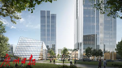 在建筑布局方面,设计将2栋办公塔楼分别布置在场地的西南角和东北角。