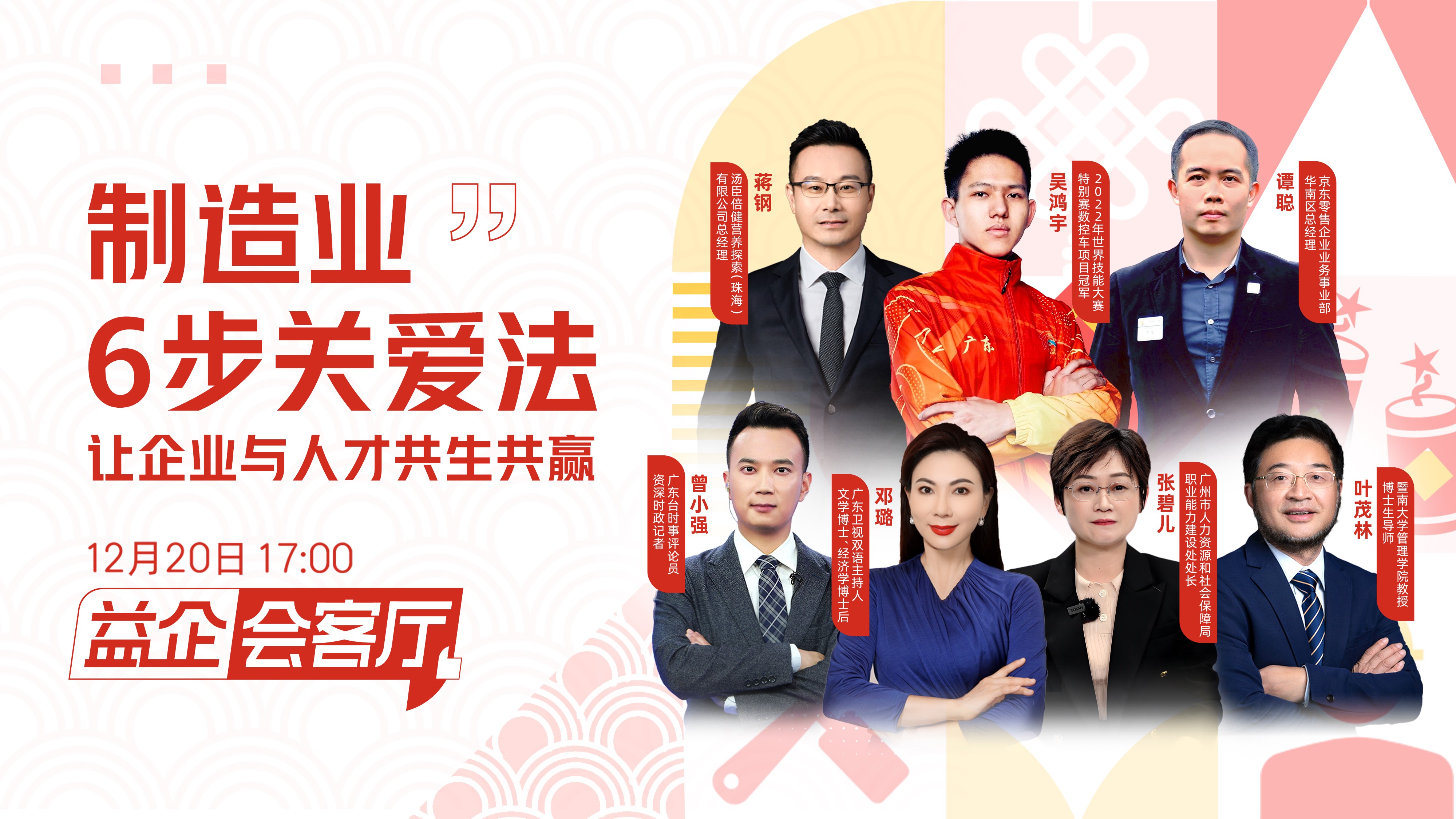 12月20日,由广东网络广播电视台联合京东企业业务推出的《益企会客厅》直播论坛节目上线。本次直播节目聚焦“制造业‘6步关爱法’,让企业与人才共生共赢”主题,高校代表、企业代表等齐聚一堂,共同探讨打造广东技能人才队伍的新方法。