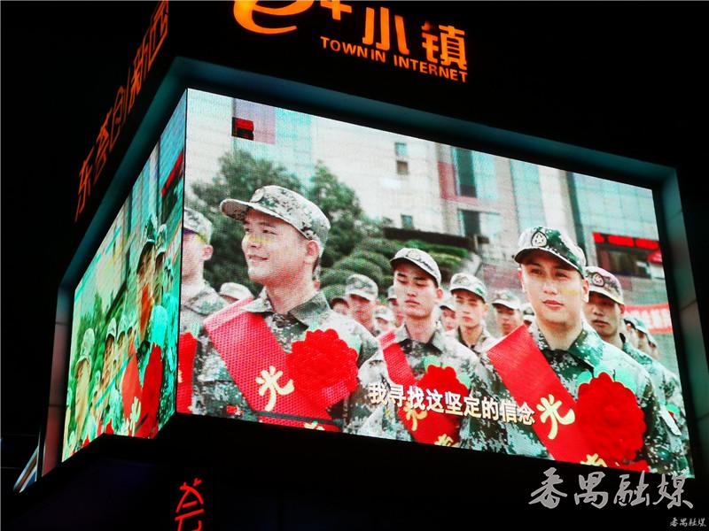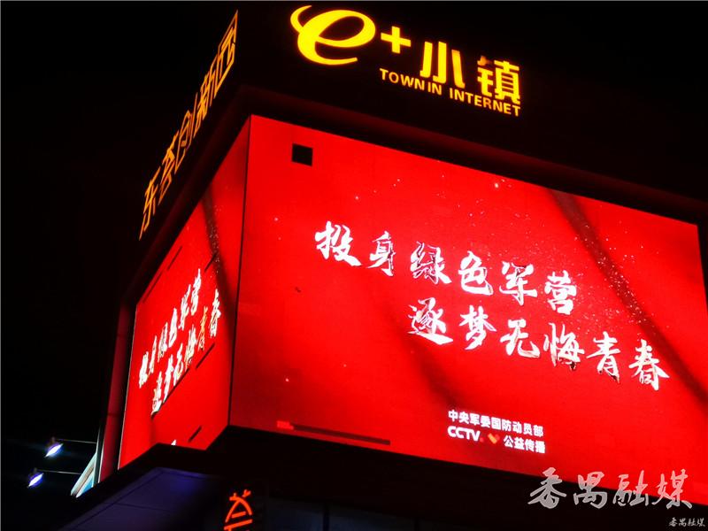 平康路沙墟一村村口临街建筑物外墙上的电子显示屏滚动播放征兵宣传视频