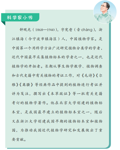 小读者在知晓与植物相关的趣闻和用途后,通过阅读科学家小传,能更真切地认识到科学家们的奋斗经历与杰出贡献,从而更深入地了解科学家,进一步体会榜样们艰苦卓绝的研究过程和锲而不舍的科研精神。