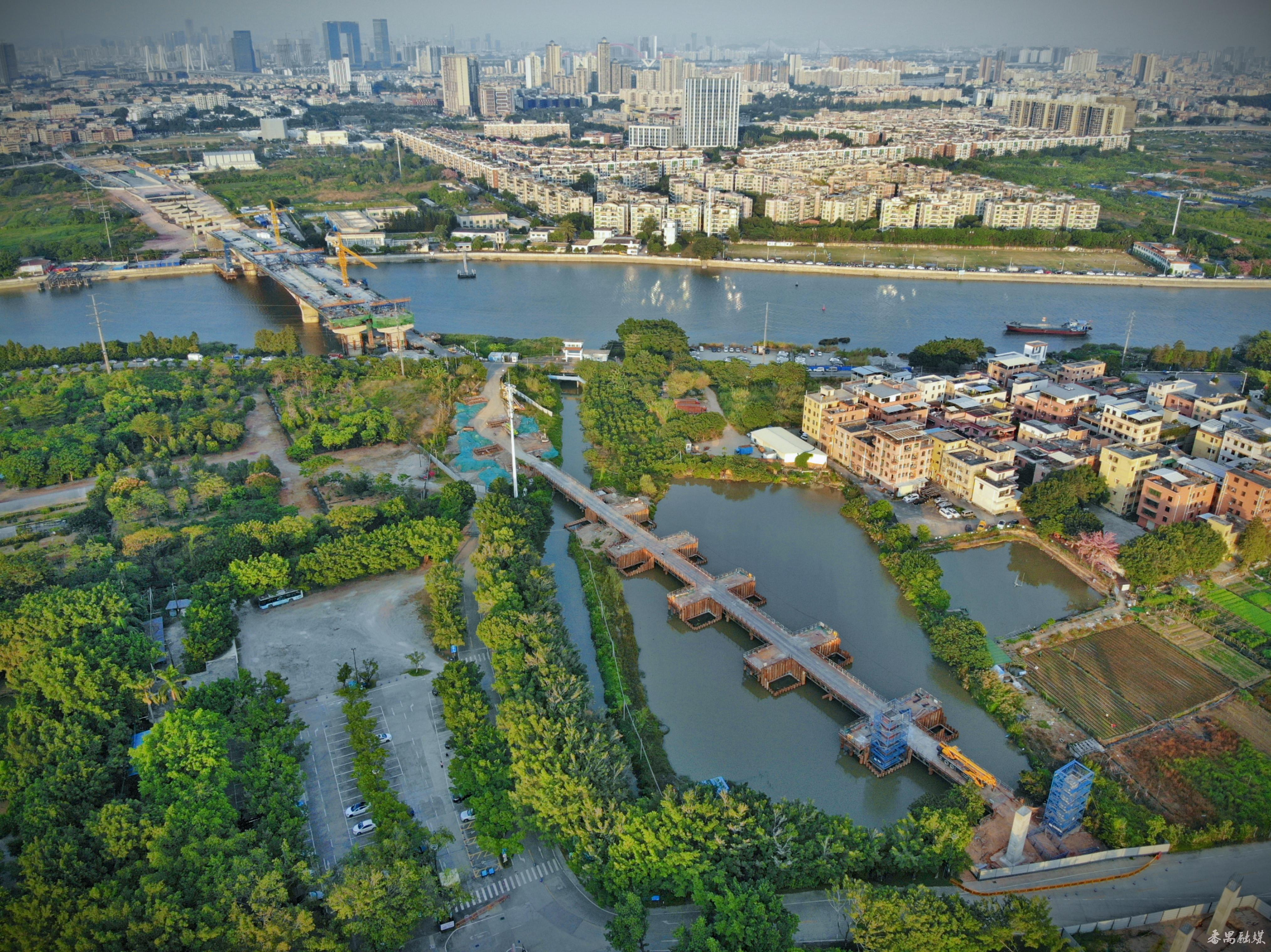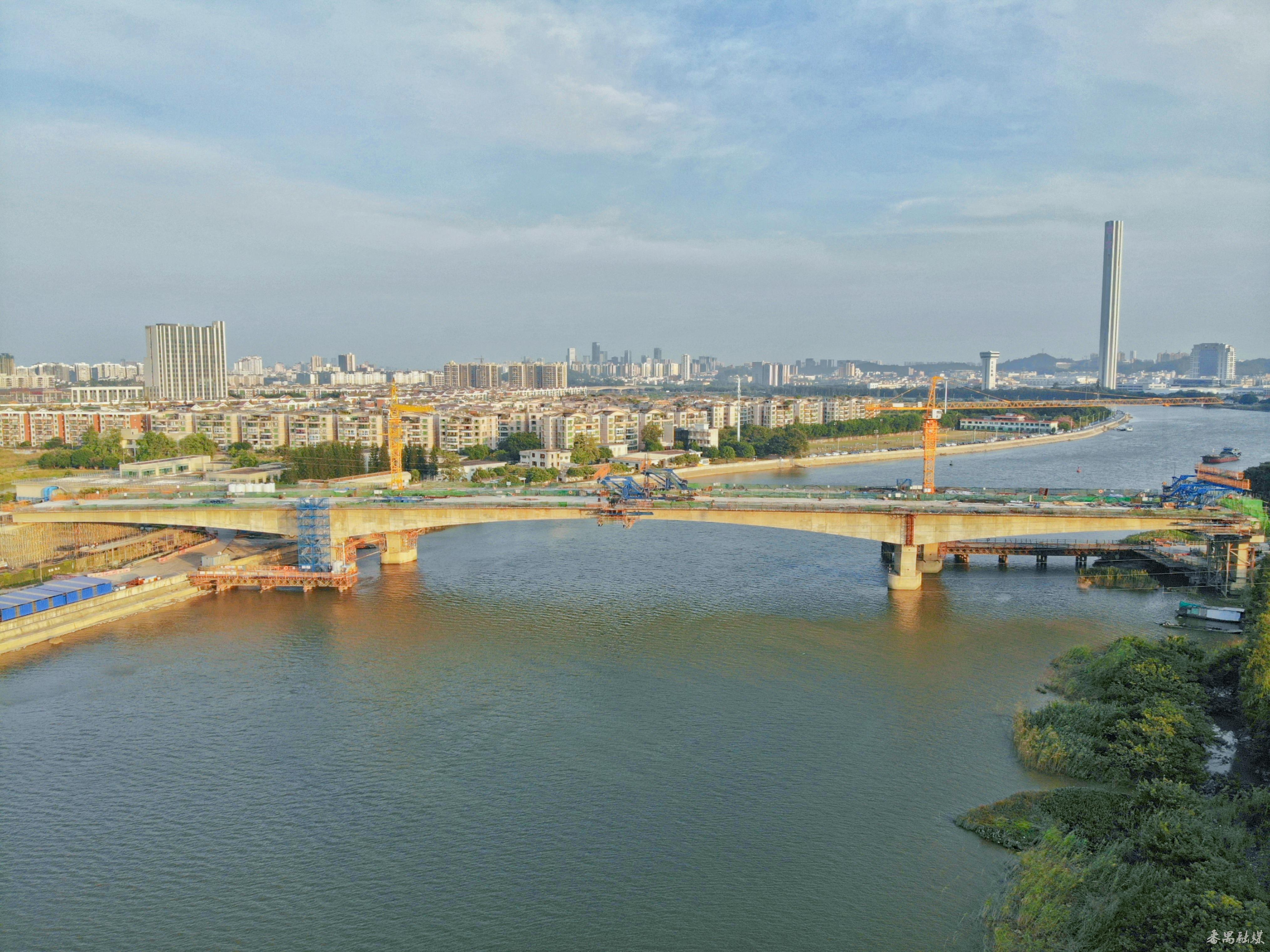 12月16日,记者在施工现场看到,项目控制性节点工程大石水道桥顺利合龙,桥梁主体已基本完工。据悉,大石水道桥采用主跨125米连续梁桥跨越Ⅳ级航道,既满足通航要求,又线形优美,与周边环境相得益彰。