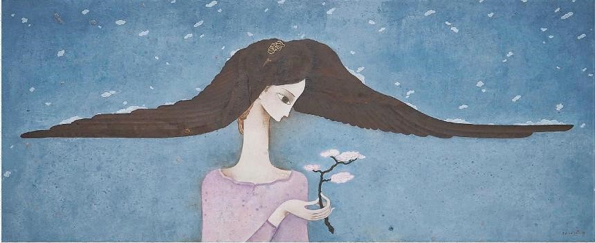 牟林童本场带来作品《我想用沉默对你讲述,像云像花像一场雪》,采用西方油画技法描绘东方故事,向大家展现李冰冰的温柔与细腻:像柔软的云,像柔美的花,还像纯净清澈的雪花。李冰冰现场分享自己的观点:“一幅画的好坏,少说话少解释,如果被劝说得喜欢了,那就没劲了。”在李冰冰表达出对这幅画喜爱的同时,却被另一位策展人段江华教授叫住,他认为这幅画主体过于单薄过于简单,画中翅膀和躯干严重脱节没有章法。