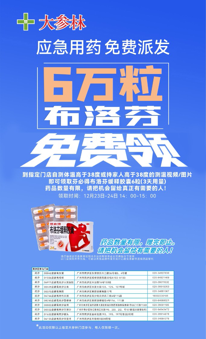 据介绍,大参林药店在全国免费发放退烧药的活动也将在南沙区实行,其中南沙有11家门店参加(横沥镇、万顷沙镇、龙穴街外均有发放点),投放布洛芬695盒,按投放每人发放6粒,能投放约2780人次。