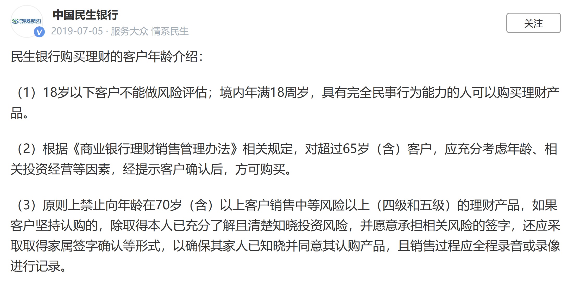 不过,也有银行对于长者购买理财产品进行了更多的风险提示。一家银行规定:“对超过65岁(含)客户,应充分考虑年龄、相关投资经验等因素,经提示客户确认后,方可购买。原则上禁止向年龄在70岁(含)以上客户销售中等风险以上(四级和五级)的理财产品,如客户坚持认购的,除取得本人已充分了解且清楚知晓投资风险,并愿意承担相关风险的签字,还应采取取得家属签字确认等形式,以确保其家人已知晓并同意其认购产品,且销售过程应全程录音或录像进行记录。”
