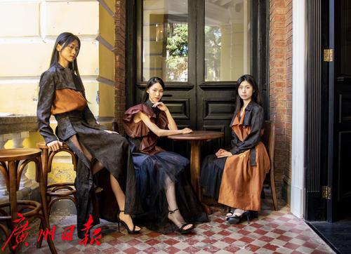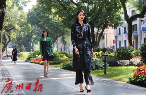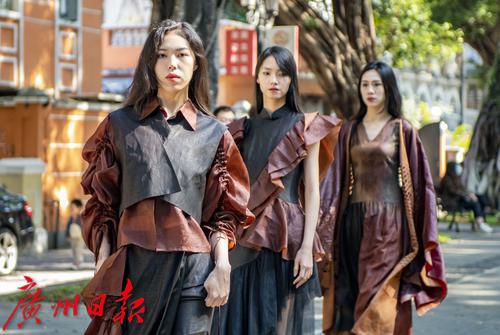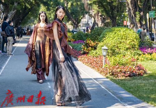 模特们在沙面的林荫道上展示优雅素净的香云纱定制服装
