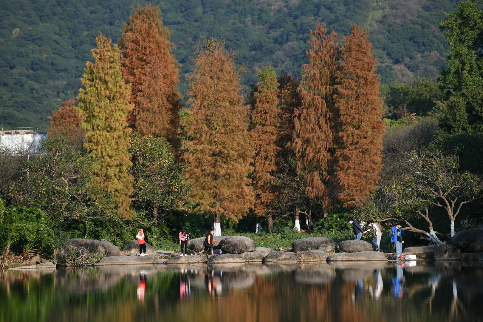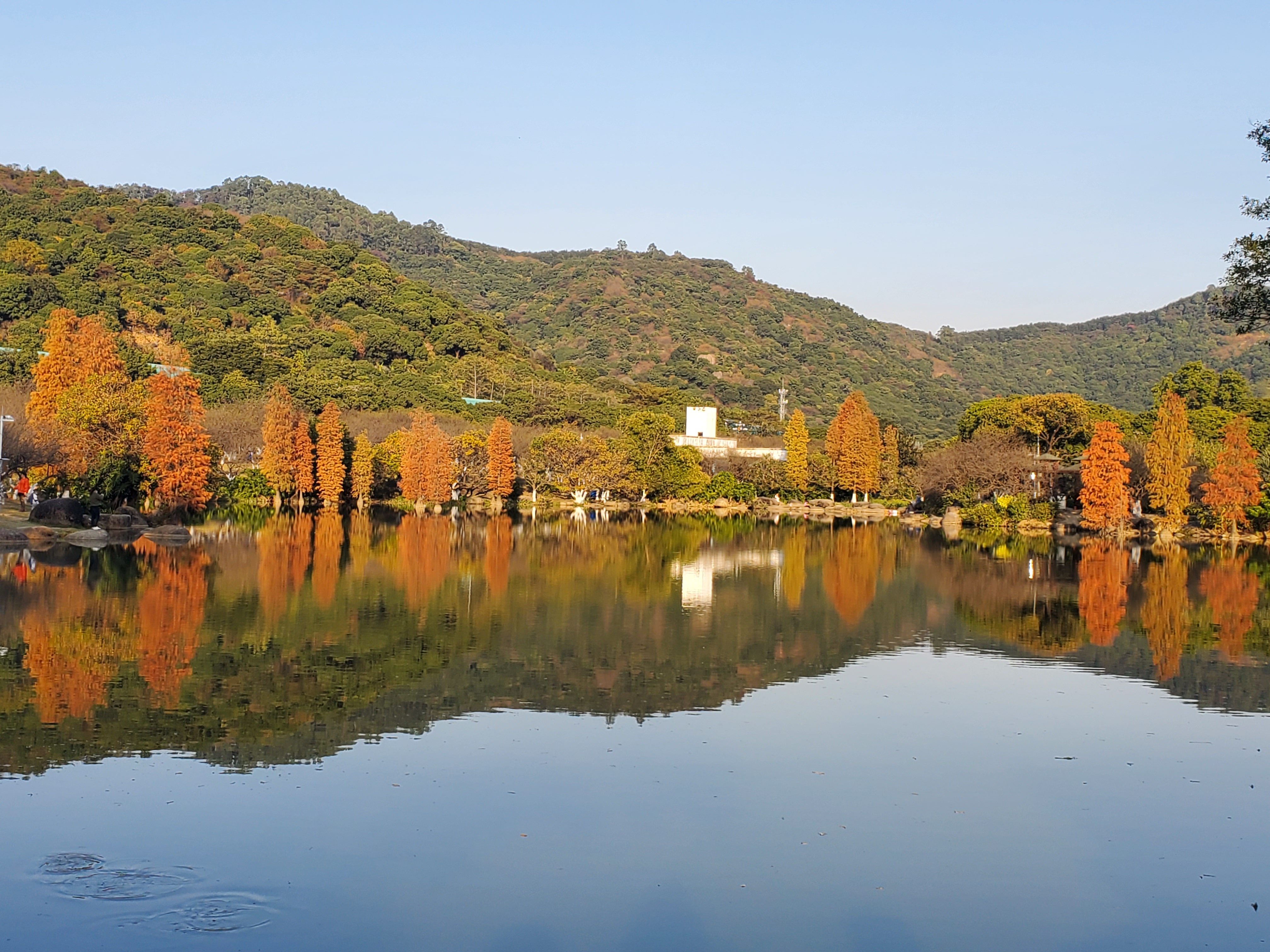 在广州黄埔的萝岗香雪公园,此时香雪初露头角,未成盛放之势,公园里的落羽杉才是最美的风景。它们绕水而居,炫目的眼颜色倒映在湖中,连湖的姿态都风姿夺目。