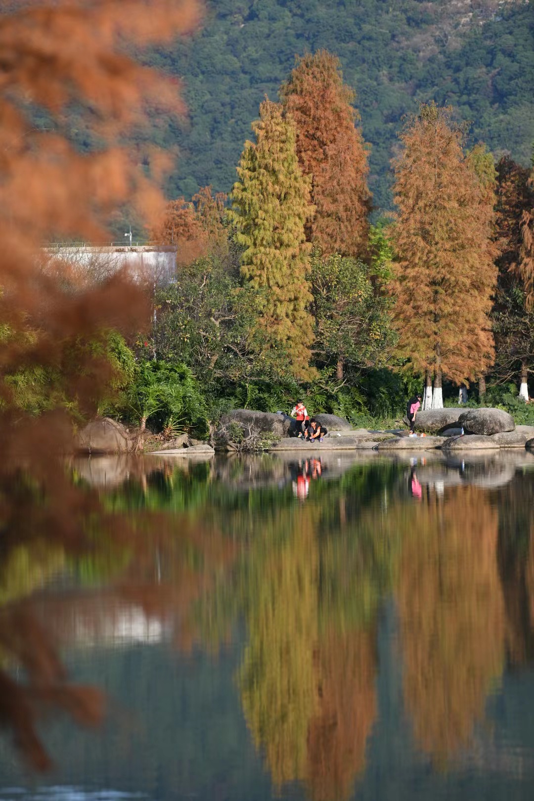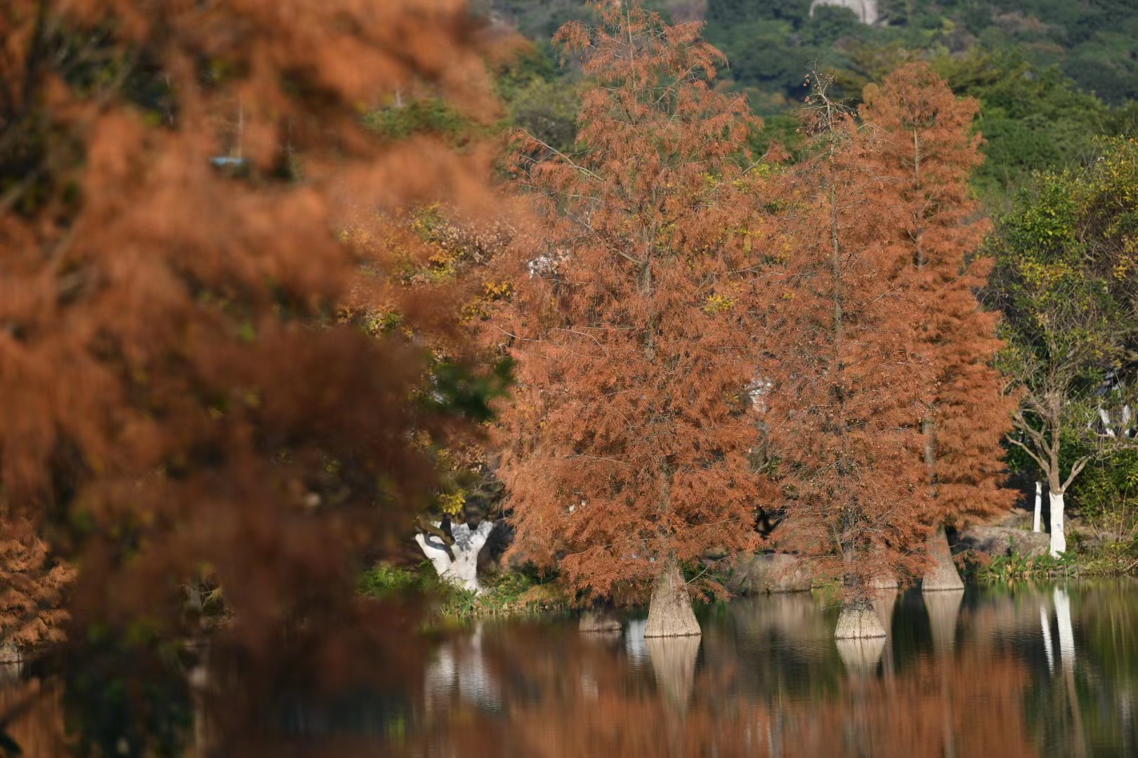 橙红、深红、嫣红、杏红……不同的红色林林总总,争先恐后夺人眼球。这就是冬日里的落羽杉,随着温度渐冷颜色渐变,在青山绿水与蓝天白云的映衬下,仿佛进入了五彩斑斓的调色盘里。