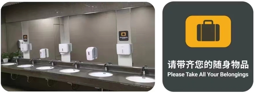 根据《中国成年人人体尺寸》和《民用机场航站区标识英文译写规范》相关标准,优化图文标识提醒,在洗手台、男性洗手间小便器上方等符合旅客视觉动线的区域设置了“请带齐您的随身物品”提醒,以达到最佳提醒效果。