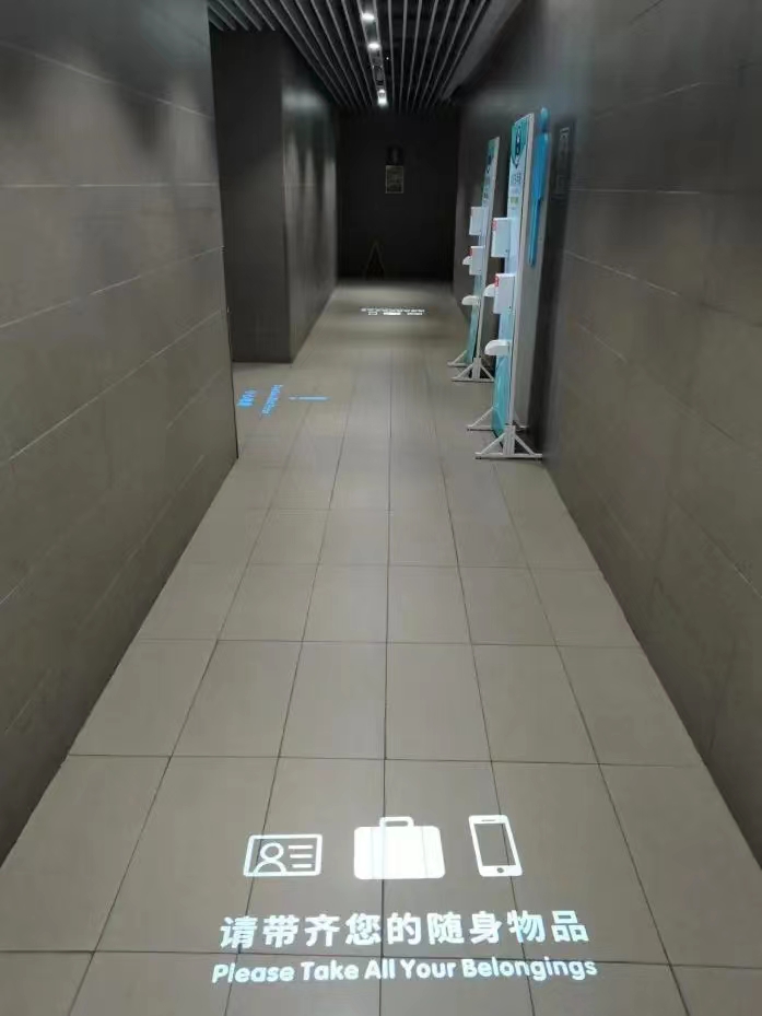 在洗手间内旅客必经的回廊地面出口处增加白色LED地面投影,并根据旅客遗失物品的种类情况,设置随身包、手机、证件等图形作为投影内容,进一步强化旅客视觉感知。