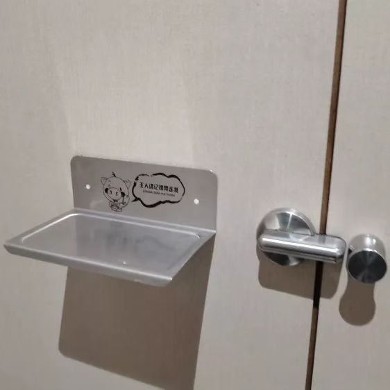 根据旅客的出门动线流程,将置物架设置于厕格的门把手旁,旅客开门离开时能够无意识地观察到置物架的物品,具有较强的辨识度和提醒功能。