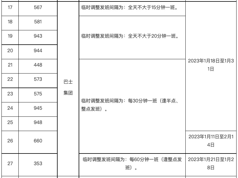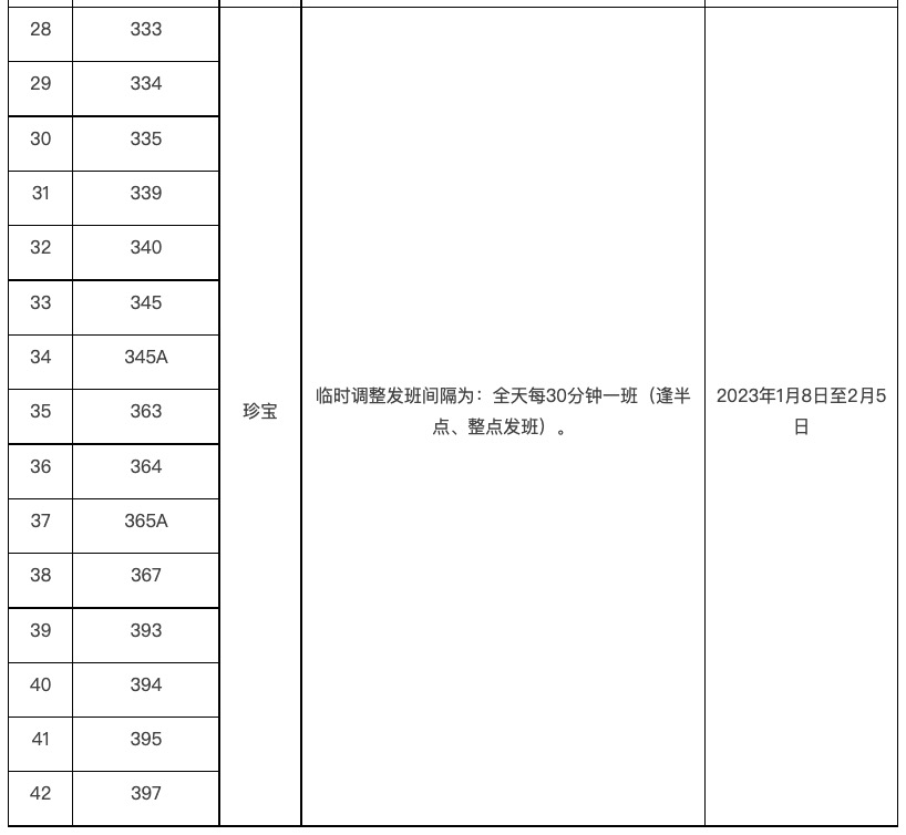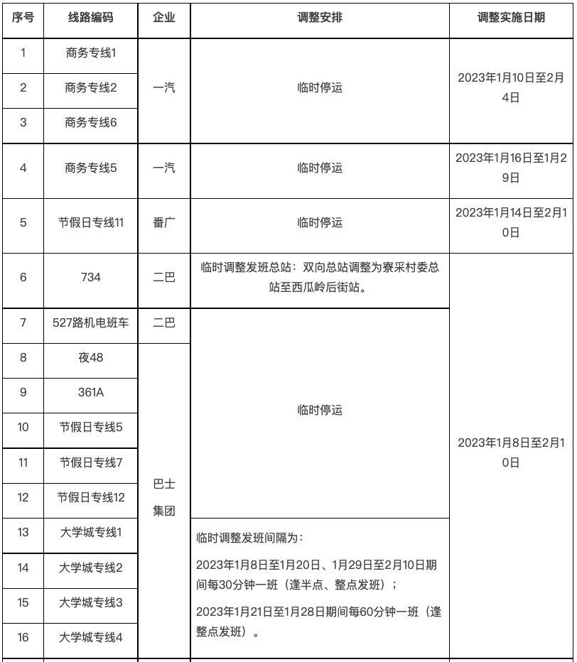 29日,广州市交通运输部门发布2023年春节期间临时调整公共汽车商务专线1路等42条线路的告示。其中提到,为进一步优化公交运营效率,结合市内部分学校和服装批发市场寒假、春节放假以及开发区等市郊区春节假期外来务工人员返乡过节、客流量大幅度下降的实际情况,市交通运输部门将临时停运公共汽车商务专线1路等11条线路,临时调整公共汽车734路等31条线路运营发班安排。其中,部分线路自1月8日起调整或停运。