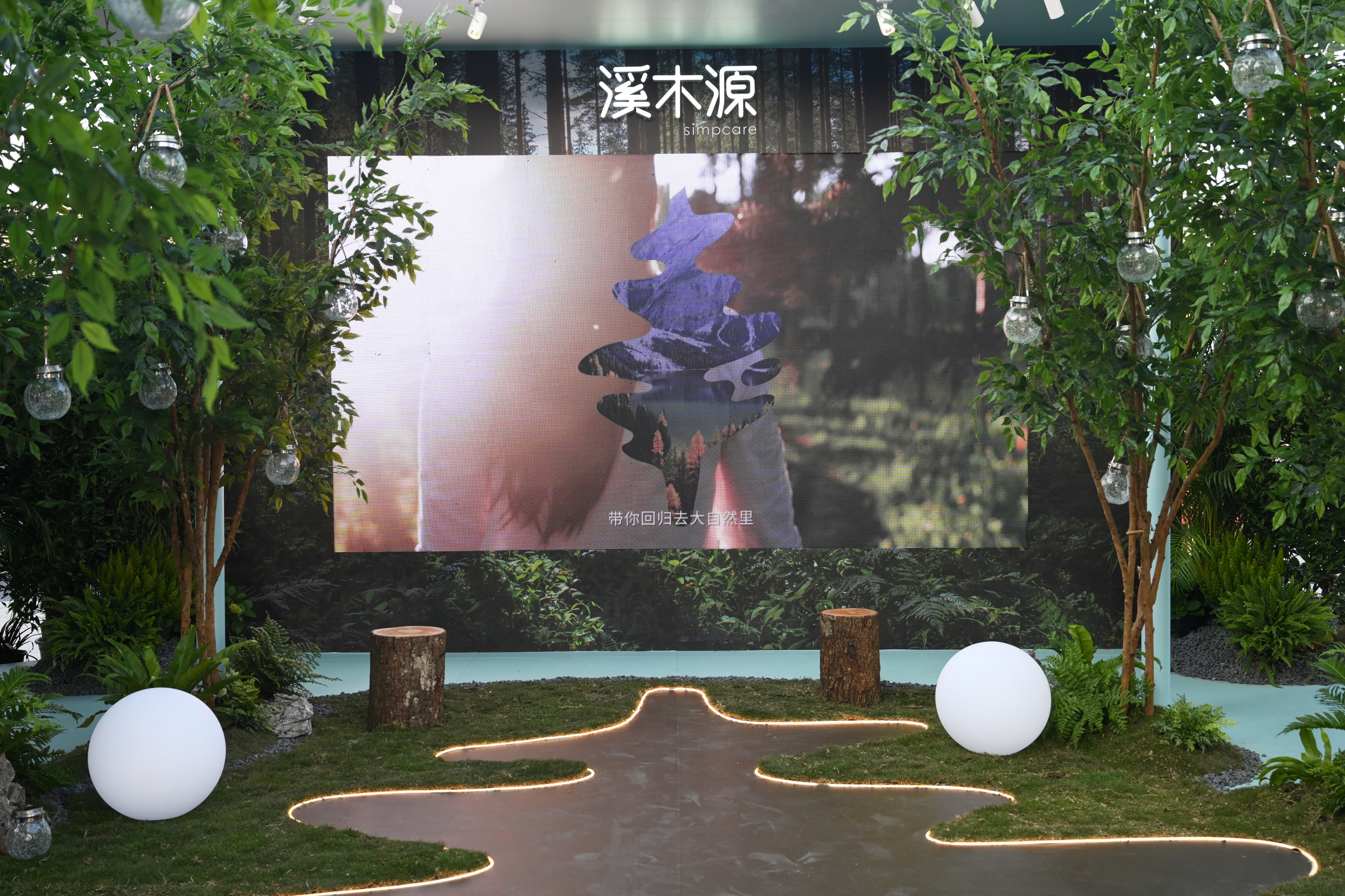 从高空俯瞰,品牌展示区域整体呈三角形,地面布满青苔和绿植,溪木源标志性的树形图案以及“自然的力量 超乎你想象”的品牌标语清晰可见。中心区域用白色木质结构围成圆形,区域内以仿真森林和各色绿植为主要景观,并有呼吸灯散落其间。正中的LED屏幕展示着品牌最新形象宣传片,屏幕两侧设有企业文化墙,呈现品牌发展历程、品牌理念等重要信息。在圆形区域两侧的入口处,设有产品体验区,在树木与绿植掩映下,陈列有山茶花、层孔菌、芋螺和愈创木系列等主打产品。