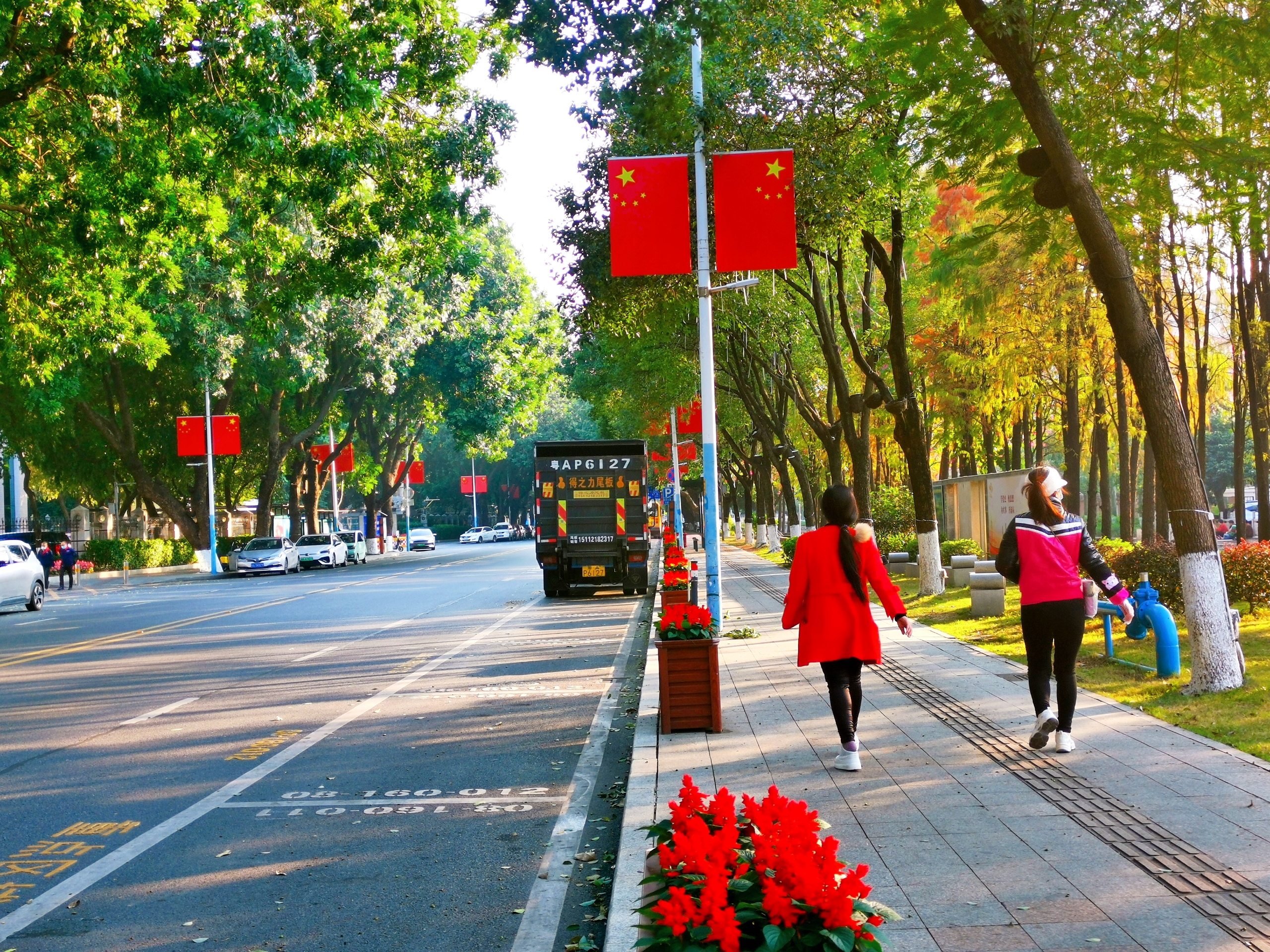 市桥街盛泰路的国旗与鲜花相映