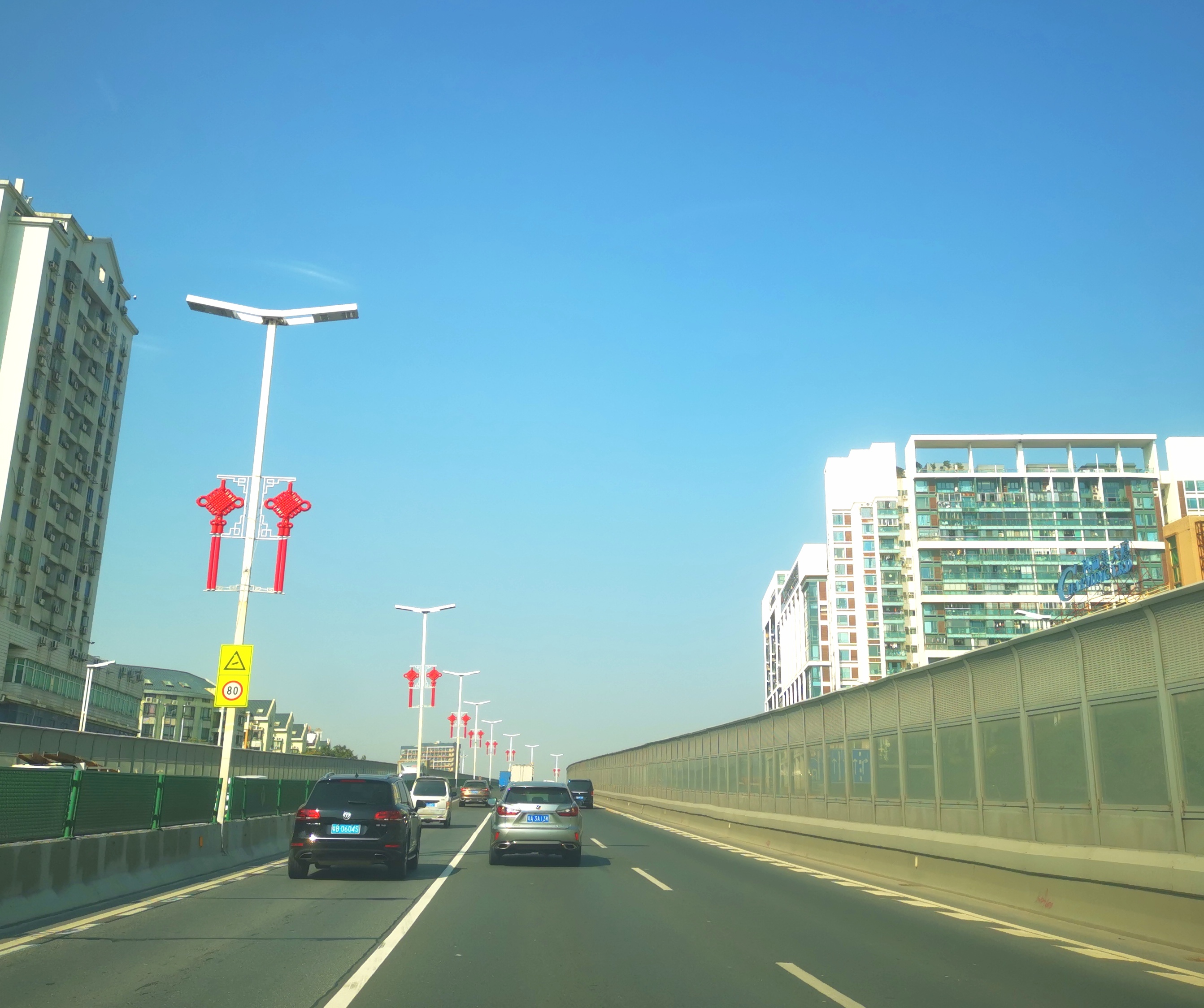 番禺大道罗家高架桥路灯杆上悬挂中国结