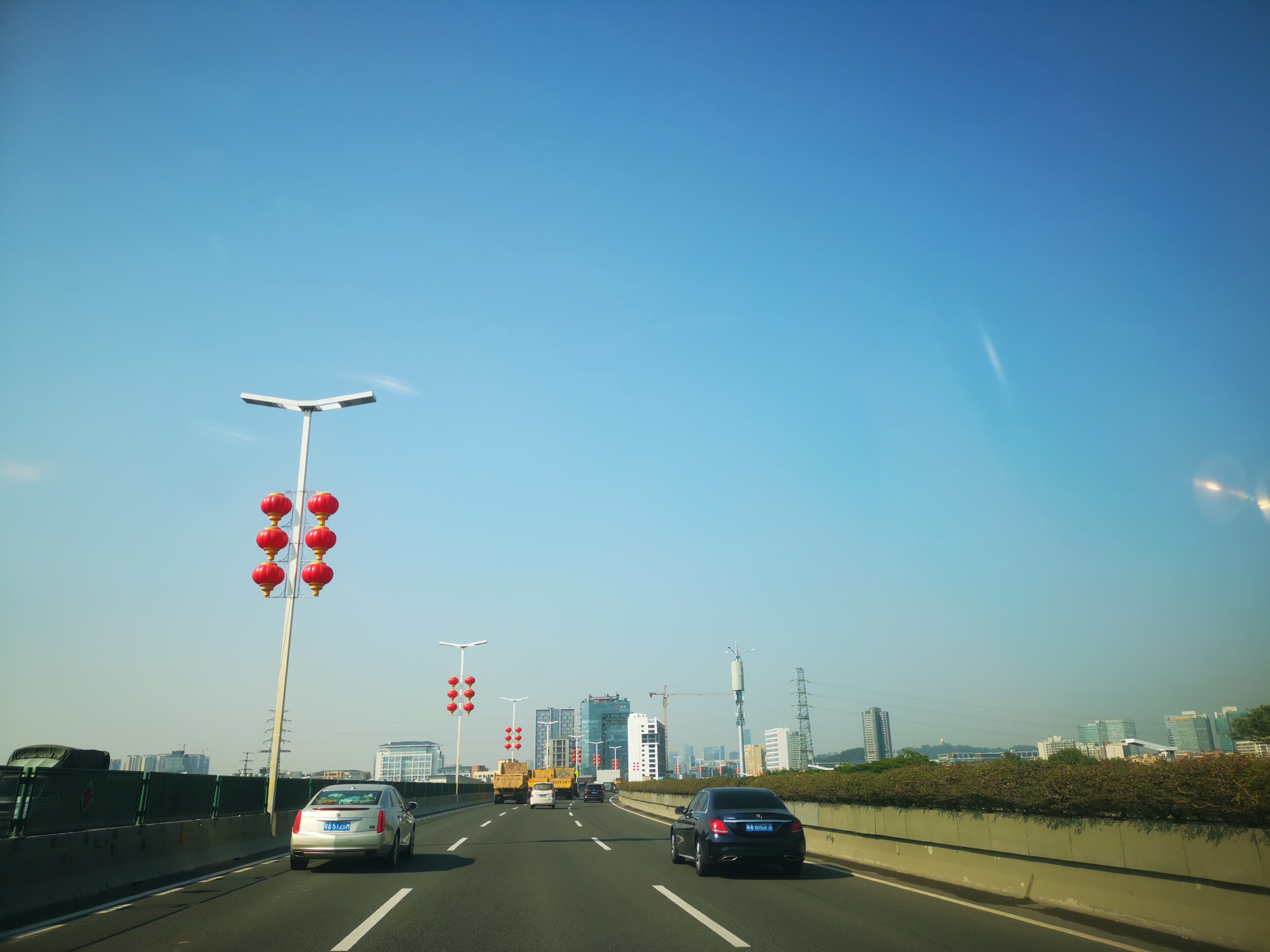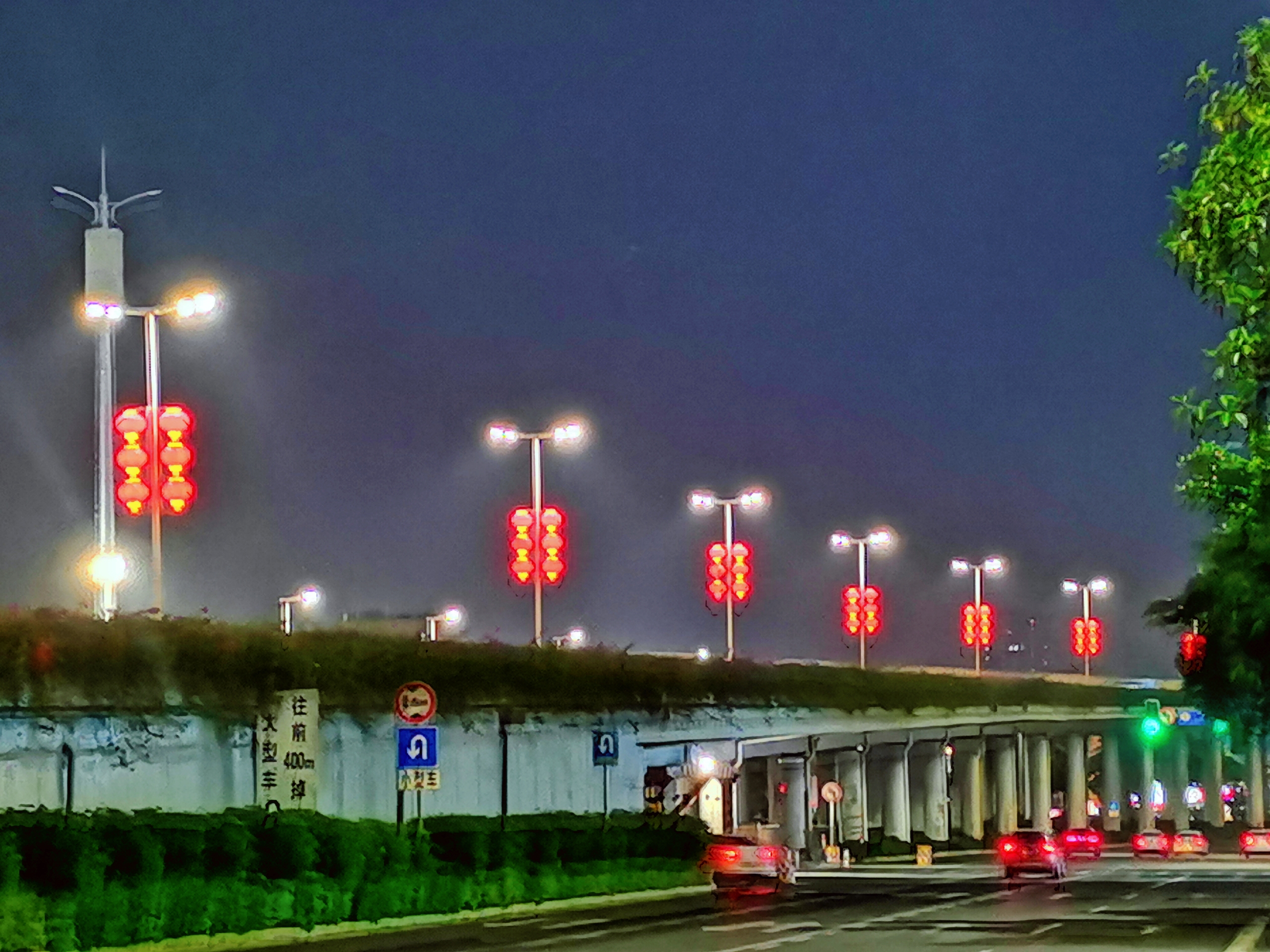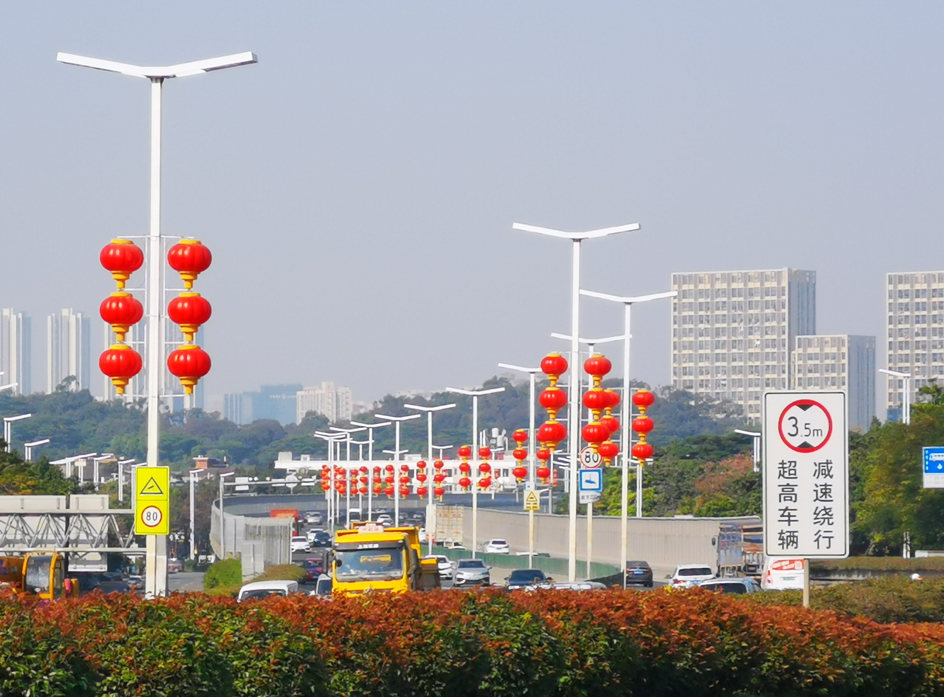 番禺大道龙美高架桥路灯杆上悬挂红灯笼