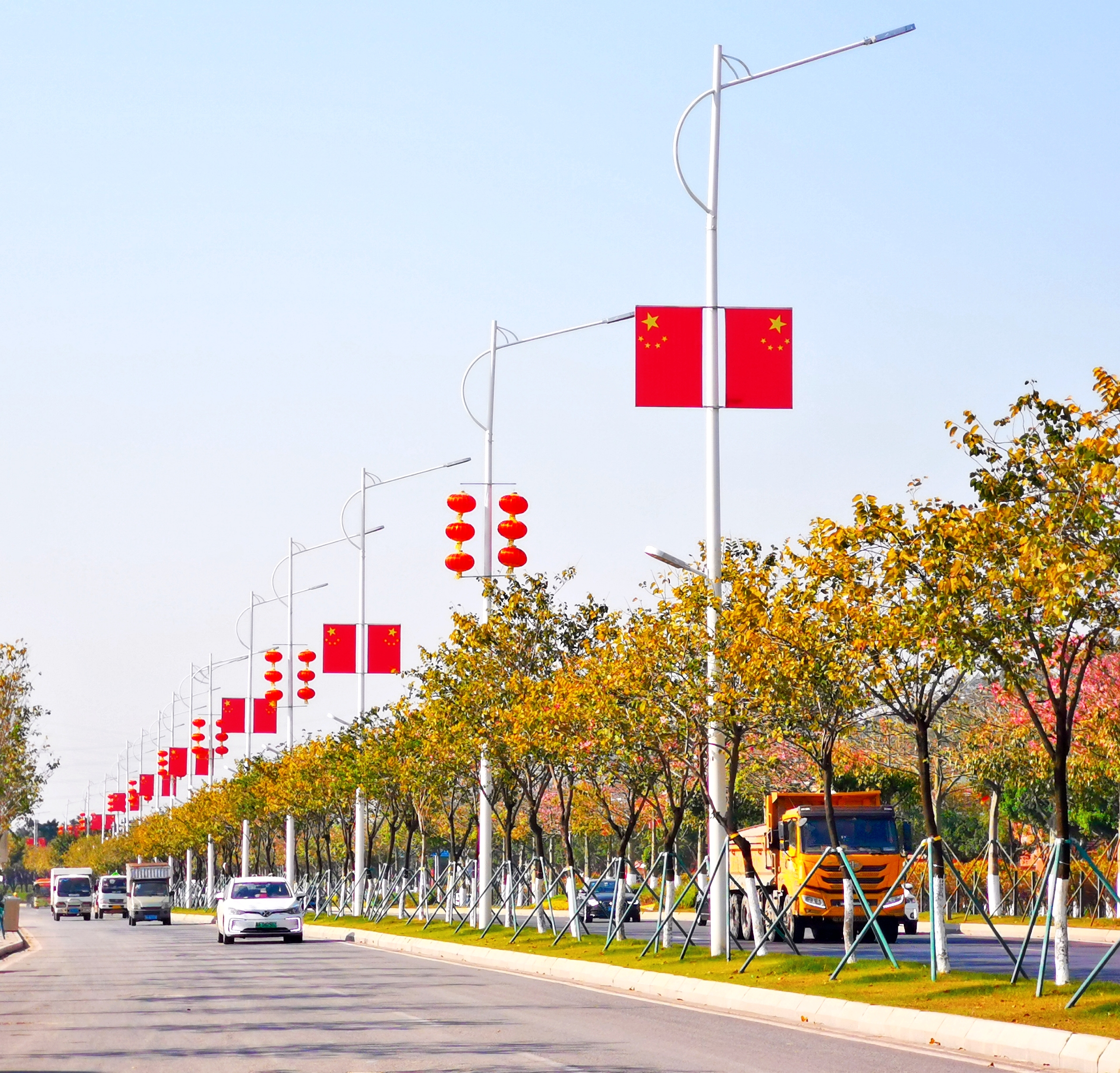 汉溪大道的国旗与灯笼相映成趣