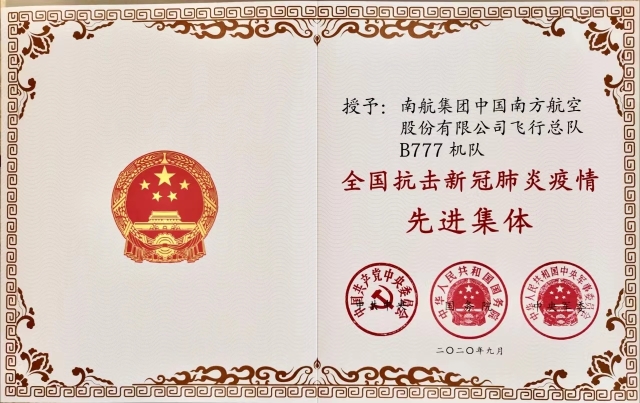 在疫情防控和复工复产的大战大考中,南航飞行总队波音777机队,作为南航唯一客货混合运行机队,逆行而上,勇挑重担,以“精锐之师”的战斗姿态冲锋在前。2020年,在全国抗击新冠肺炎疫情表彰大会上,南航飞行总队波音777机队曾荣获“先进集体”称号。