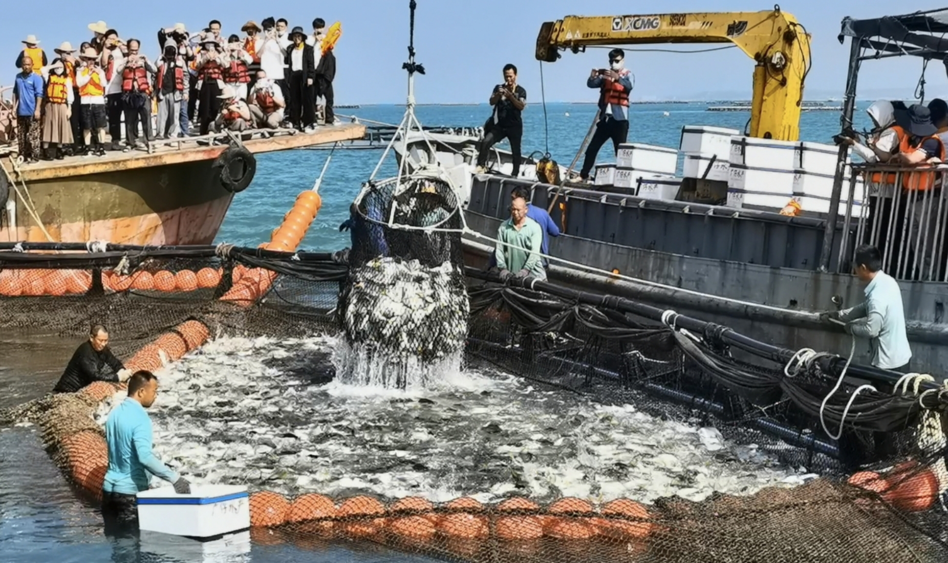 遂溪县草潭工作队帮扶金鲳鱼丰收的场面