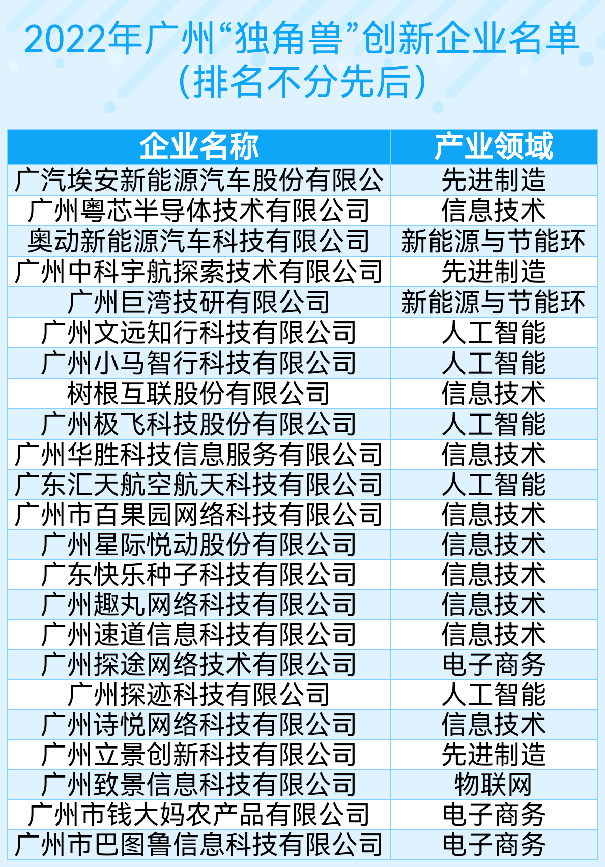 12月30日,2022年广州“独角兽”创新企业榜单正式发布。广汽埃安新能源汽车股份有限公司等23家企业入选“独角兽”创新企业,云舟生物科技( 广州) 股份有限公司等82家企业入选“未来独角兽”创新企业,广州市艾贝泰生物科技有限公司等51家企业入选“种子独角兽”企业,广州粤芯半导体技术有限公司等50家企业入选“高精尖”企业。