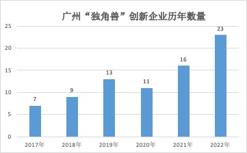 根据榜单历史数据,“独角兽”创新企业数量由2017年的7家增加到2022年的23家,年均增长率近30%,“未来独角兽”创新企业数量由2017年的20家增加到2022年的82家,“种子独角兽”创新企业数量由2021年的25家增加到2022年的51家,“高精尖“企业数量由2018年的10家增加到2022年的50家,体现出广州近年来成长型新兴产业快速发展和新经济的强大活力。