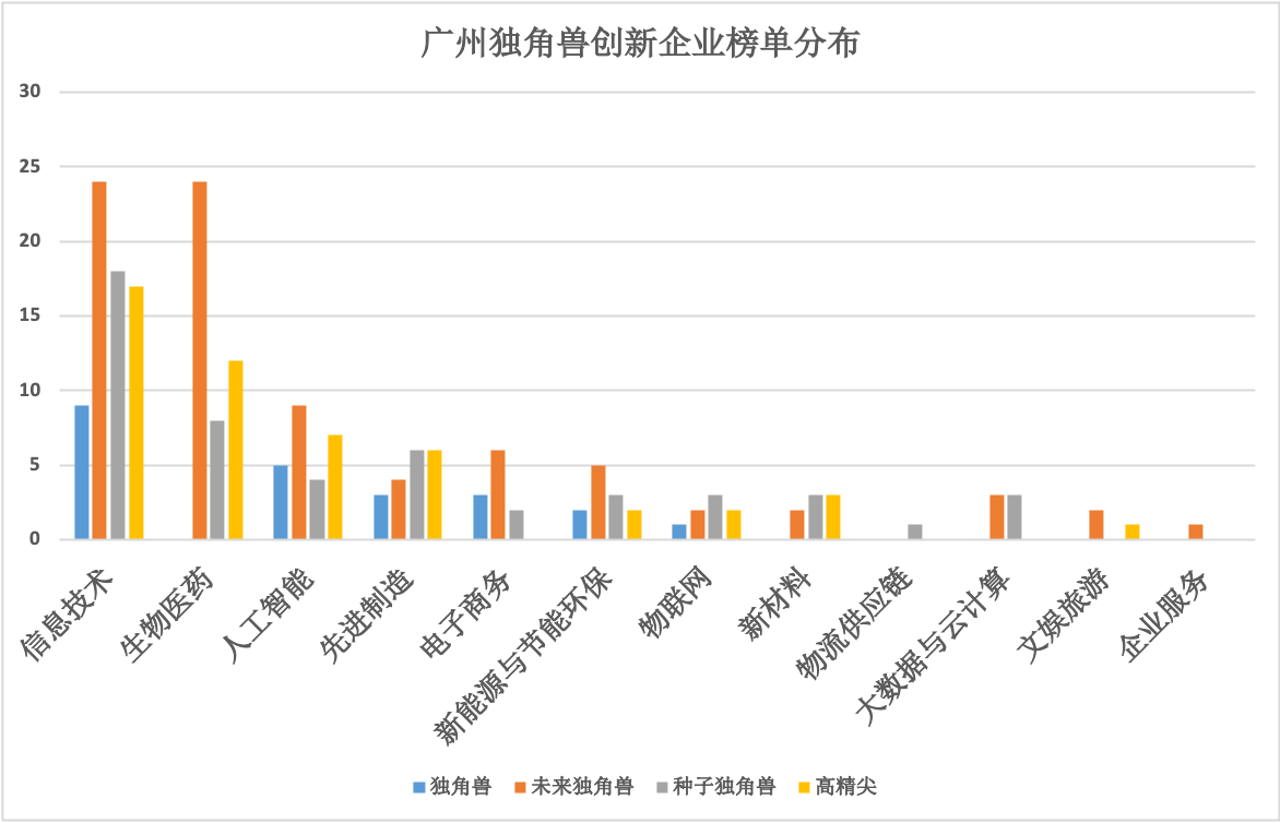 近年来,广州建立“科技型中小企业—高新技术企业—硬科技企业—独角兽企业—上市高新技术企业”的梯次培育体系,促进产业链融合发展,推动独角兽榜单群体形成信息技术、生物医药、人工智能、先进制造、电子商务、新材料与节能环保六大产业集群。