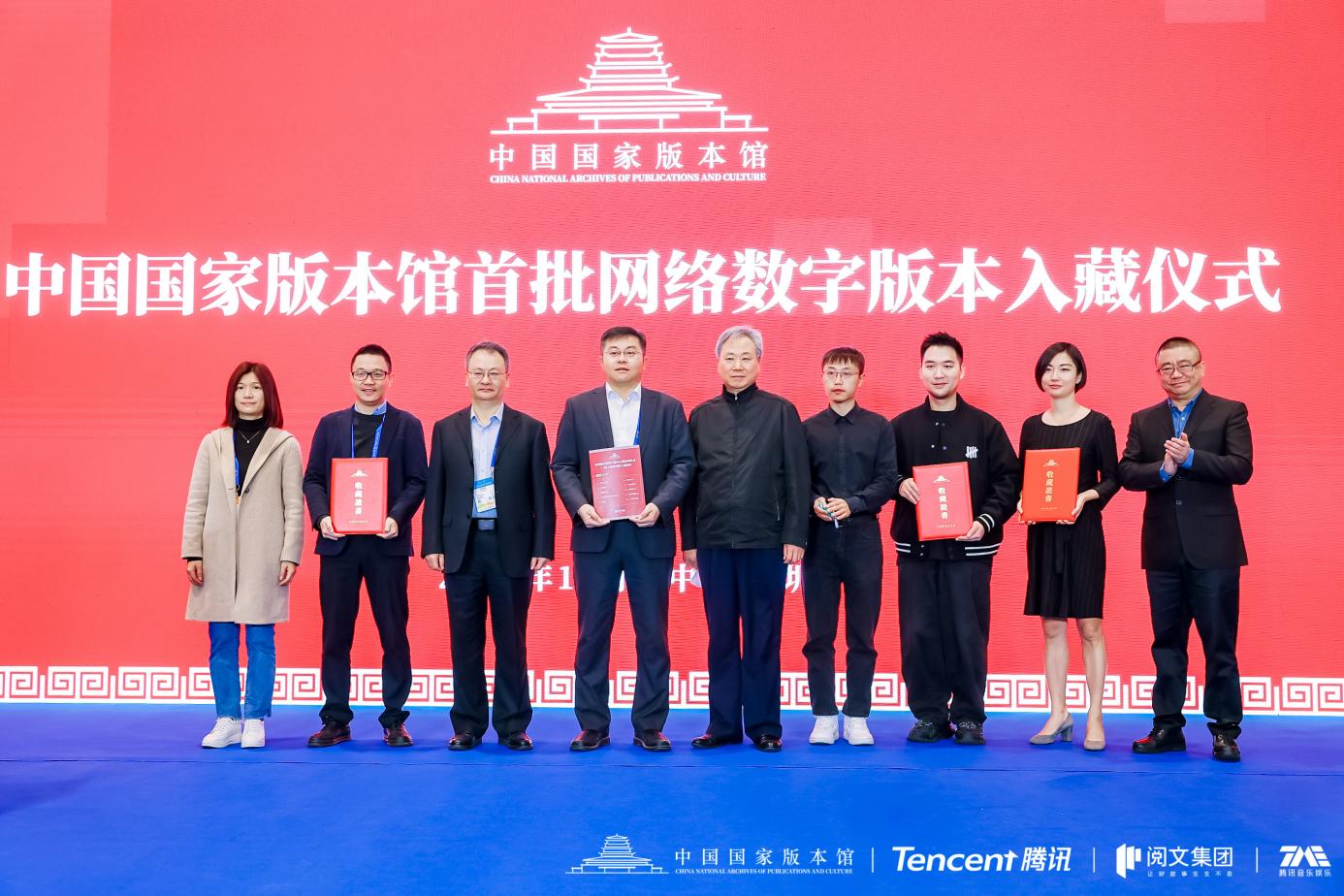 2022年12月29日上午,中国国家版本馆联合腾讯公司、阅文集团、腾讯音乐娱乐集团,在深圳文博会现场举行“中国国家版本馆首批网络数字版本入藏仪式 ”,接收三家互联网企业首批网络文学、网络视频、网络游戏、数字文保及数字音乐五大类45项优秀网络数字版本入藏。中国国家版本馆向三家企业发放了收藏证书。