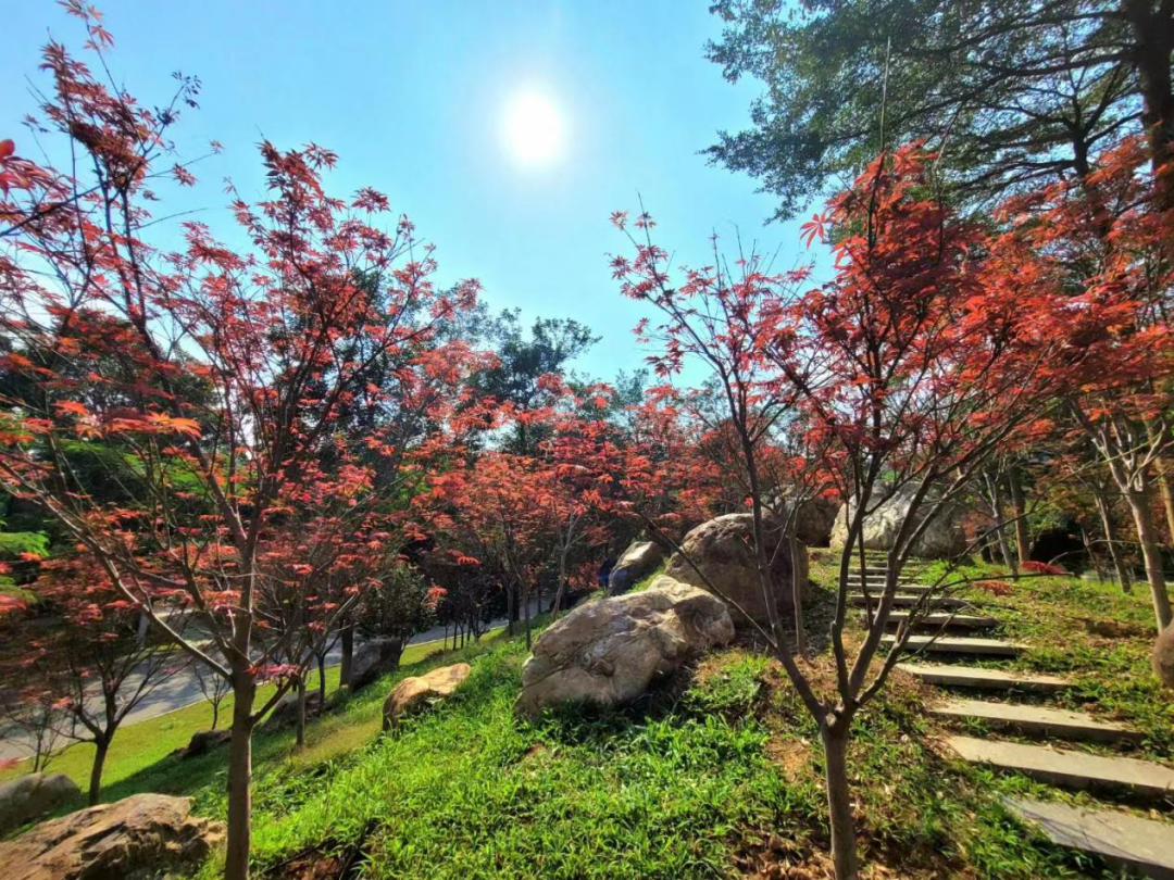 而红枫园的红枫,更是红艳似火,在冬日暖阳下呈现出瑰丽多变的色彩,成为帽峰山一道亮丽的“枫”景,随手一拍都是风景大片。