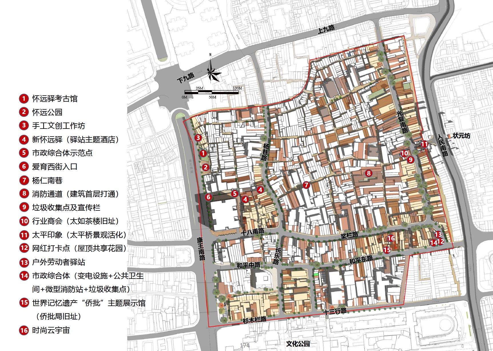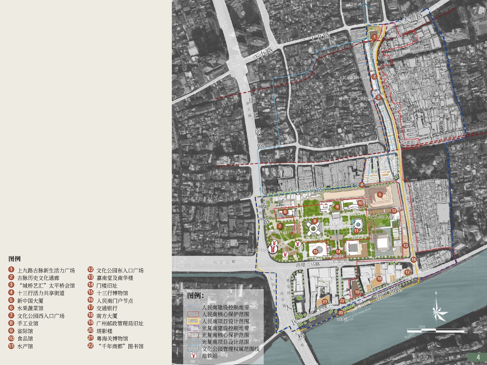项目保留人民南、光复南居住主导功能,依托光复南、人民南街区商贸中心,延续十八甫怀远驿、十三行及广州作为“千年商都”外贸窗口文化印记,完善居住、产业基础设施配套,促进产业转型、业态高端化发展,做到历史可读化、生活便捷化、功能灵活化、创意多元化,打造宜居、宜业的融合新街坊和市级公共文化、商旅活动中心。