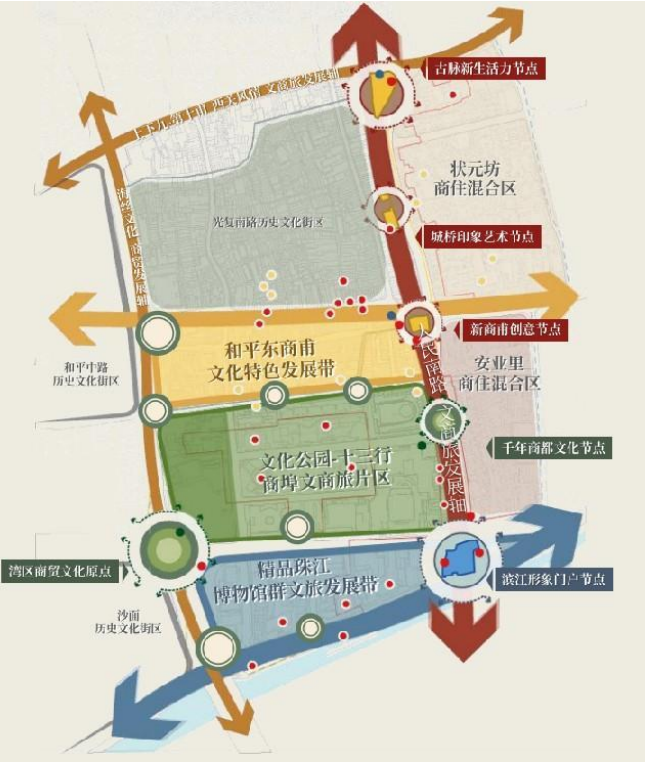 N个历史传承与文商旅特色节点——湾区商贸文化原点、古脉新生活力节点、城桥印象艺术节点、千年商都文化节点、新商甫创意节点、滨江形象门户节点等。