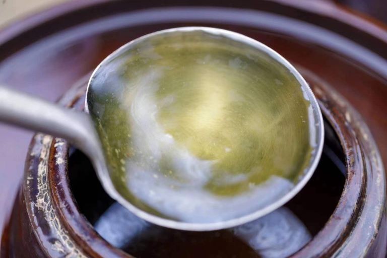 刚刚炒的金色米捞起来散发着阵阵热气,用测温器一量,温度居然高达200度。这时候,需要工作人员用特殊的装备把热腾腾的米倒入醋坛中,加入山泉水或者井水,然后把醋坛的口严严实实地封好,再弄个瓦盘盖起来放到通风晒阳的地方保存。头三个月每七天左右,工作人员还要打开醋坛,检查发酵情况,放一下气。等三个月后“醋”安静下来,就可以做日常管理。“经过四个季度的发酵以后,那时候醋的汤色呈金黄色,闻起来有点臭,可以开封即饮,此时的醋煮出来的醋汤味道最为鲜美。”黄伟华说道。